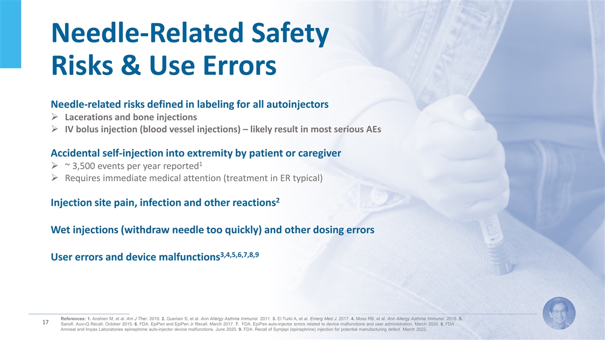 Needle-Related Safety Risks & Use Errors Needle-related risks defined in labeling for all autoinjectors Ø Lacerations and bone injections Ø IV bolus injection (blood vessel injections) – likely result in most serious AEs Accidental self-injection into extremity by patient or caregiver 1 Ø ~ 3,500 events per year reported Ø Requires immediate medical attention (treatment in ER typical) 2 Injection site pain, infection and other reactions Wet injections (withdraw needle too quickly) and other dosing errors 3,4,5,6,7,8,9 User errors and device malfunctions References: 1. Anshien M, et al. Am J Ther. 2019. 2. Guerlain S, et al. Ann Allergy Asthma Immunol. 2011. 3. El Turki A, et al. Emerg Med J. 2017. 4. Moss RB, et al. Ann Allergy Asthma Immunol. 2018. 5. 17 Sanofi. Auvi-Q Recall. October 2015. 6. FDA. EpiPen and EpiPen Jr Recall. March 2017. 7. FDA. EpiPen auto-injector errors related to device malfunctions and user administration. March 2020. 8. FDA. Amneal and Impax Laboratories epinephrine auto-injector device malfunctions. June 2020. 9. FDA. Recall of Symjepi (epinephrine) injection for potential manufacturing defect. March 2022.