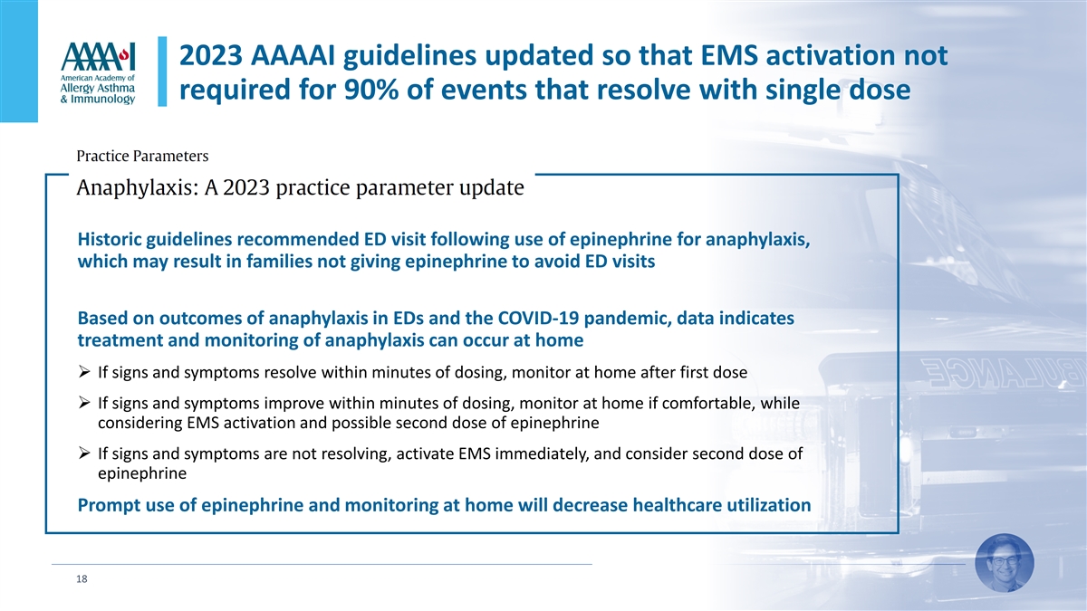 2023 AAAAI guidelines updated so that EMS activation not required for 90% of events that resolve with single dose Historic guidelines recommended ED visit following use of epinephrine for anaphylaxis, which may result in families not giving epinephrine to avoid ED visits Based on outcomes of anaphylaxis in EDs and the COVID-19 pandemic, data indicates treatment and monitoring of anaphylaxis can occur at home Ø If signs and symptoms resolve within minutes of dosing, monitor at home after first dose Ø If signs and symptoms improve within minutes of dosing, monitor at home if comfortable, while considering EMS activation and possible second dose of epinephrine Ø If signs and symptoms are not resolving, activate EMS immediately, and consider second dose of epinephrine Prompt use of epinephrine and monitoring at home will decrease healthcare utilization 18