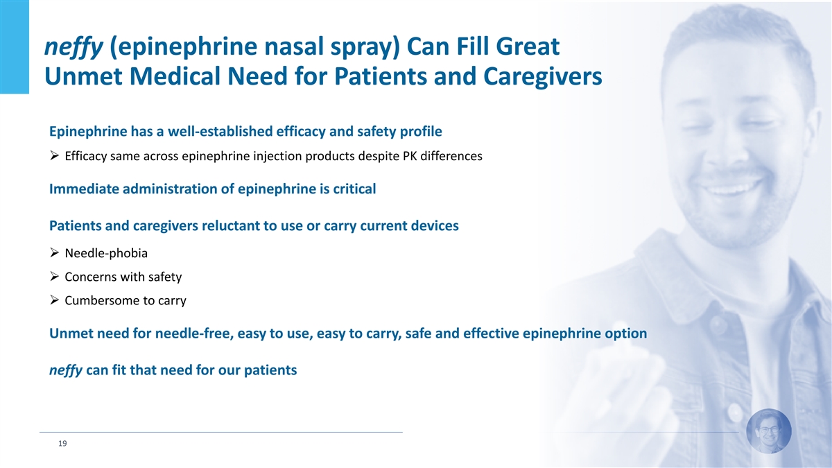 neffy (epinephrine nasal spray) Can Fill Great Unmet Medical Need for Patients and Caregivers Epinephrine has a well-established efficacy and safety profile Ø Efficacy same across epinephrine injection products despite PK differences Immediate administration of epinephrine is critical Patients and caregivers reluctant to use or carry current devices Ø Needle-phobia Ø Concerns with safety Ø Cumbersome to carry Unmet need for needle-free, easy to use, easy to carry, safe and effective epinephrine option neffy can fit that need for our patients 19