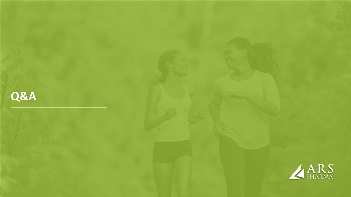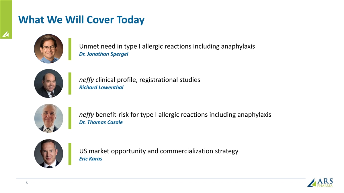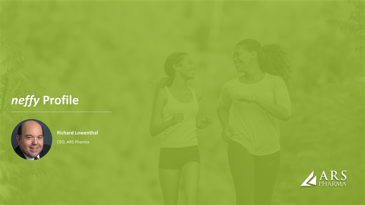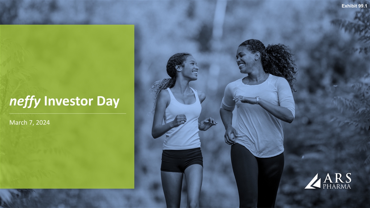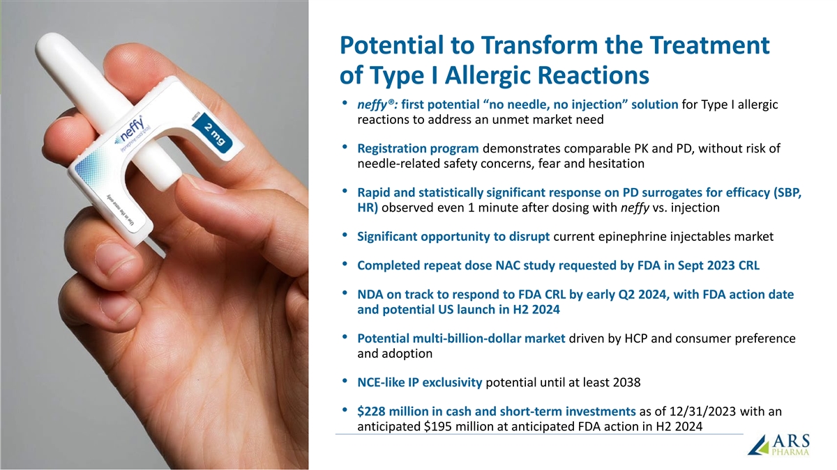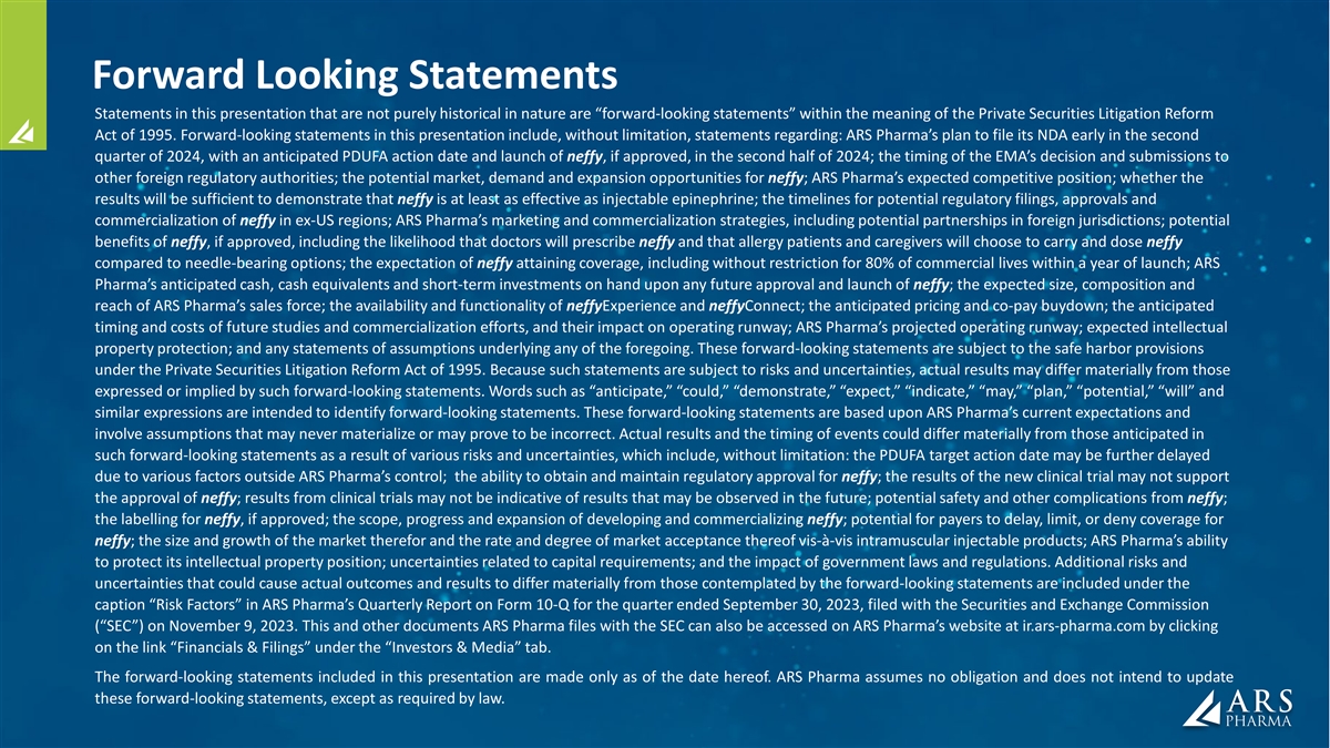 Forward Looking Statements Statements in this presentation that are not purely historical in nature are “forward-looking statements” within the meaning of the Private Securities Litigation Reform Act of 1995. Forward-looking statements in this presentation include, without limitation, statements regarding: ARS Pharma’s plan to file its NDA early in the second quarter of 2024, with an anticipated PDUFA action date and launch of neffy, if approved, in the second half of 2024; the timing of the EMA’s decision and submissions to other foreign regulatory authorities; the potential market, demand and expansion opportunities for neffy; ARS Pharma’s expected competitive position; whether the results will be sufficient to demonstrate that neffy is at least as effective as injectable epinephrine; the timelines for potential regulatory filings, approvals and commercialization of neffy in ex-US regions; ARS Pharma’s marketing and commercialization strategies, including potential partnerships in foreign jurisdictions; potential benefits of neffy, if approved, including the likelihood that doctors will prescribe neffy and that allergy patients and caregivers will choose to carry and dose neffy compared to needle-bearing options; the expectation of neffy attaining coverage, including without restriction for 80% of commercial lives within a year of launch; ARS Pharma’s anticipated cash, cash equivalents and short-term investments on hand upon any future approval and launch of neffy; the expected size, composition and reach of ARS Pharma’s sales force; the availability and functionality of neffyExperience and neffyConnect; the anticipated pricing and co-pay buydown; the anticipated timing and costs of future studies and commercialization efforts, and their impact on operating runway; ARS Pharma’s projected operating runway; expected intellectual property protection; and any statements of assumptions underlying any of the foregoing. These forward-looking statements are subject to the safe harbor provisions under the Private Securities Litigation Reform Act of 1995. Because such statements are subject to risks and uncertainties, actual results may differ materially from those expressed or implied by such forward-looking statements. Words such as “anticipate,” “could,” “demonstrate,” “expect,” “indicate,” “may,” “plan,” “potential,” “will” and similar expressions are intended to identify forward-looking statements. These forward-looking statements are based upon ARS Pharma’s current expectations and involve assumptions that may never materialize or may prove to be incorrect. Actual results and the timing of events could differ materially from those anticipated in such forward-looking statements as a result of various risks and uncertainties, which include, without limitation: the PDUFA target action date may be further delayed due to various factors outside ARS Pharma’s control; the ability to obtain and maintain regulatory approval for neffy; the results of the new clinical trial may not support the approval of neffy; results from clinical trials may not be indicative of results that may be observed in the future; potential safety and other complications from neffy; the labelling for neffy, if approved; the scope, progress and expansion of developing and commercializing neffy; potential for payers to delay, limit, or deny coverage for neffy; the size and growth of the market therefor and the rate and degree of market acceptance thereof vis-à-vis intramuscular injectable products; ARS Pharma’s ability to protect its intellectual property position; uncertainties related to capital requirements; and the impact of government laws and regulations. Additional risks and uncertainties that could cause actual outcomes and results to differ materially from those contemplated by the forward-looking statements are included under the caption “Risk Factors” in ARS Pharma’s Quarterly Report on Form 10-Q for the quarter ended September 30, 2023, filed with the Securities and Exchange Commission (“SEC”) on November 9, 2023. This and other documents ARS Pharma files with the SEC can also be accessed on ARS Pharma’s website at ir.ars-pharma.com by clicking on the link “Financials & Filings” under the “Investors & Media” tab. The forward-looking statements included in this presentation are made only as of the date hereof. ARS Pharma assumes no obligation and does not intend to update these forward-looking statements, except as required by law.