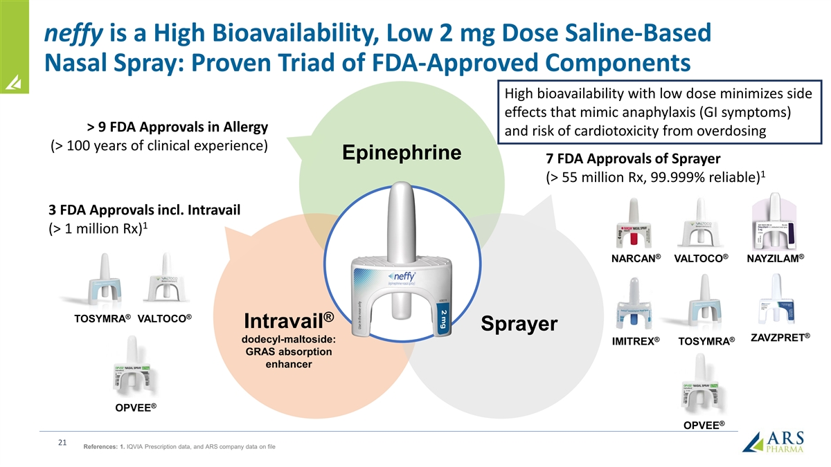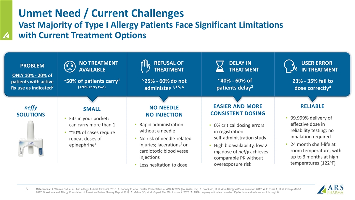 Unmet Need / Current Challenges Vast Majority of Type I Allergy Patients Face Significant Limitations with Current Treatment Options NO TREATMENT REFUSAL OF DELAY IN USER ERROR PROBLEM AVAILABLE TREATMENT TREATMENT IN TREATMENT ONLY 10% - 20% of 1 ~40% - 60% of ~50% of patients carry ~25% - 60% do not 23% - 35% fail to patients with active 2 7 (<20% carry two) , 1,3 5, 6 4 Rx use as indicated patients delay administer dose correctly EASIER AND MORE RELIABLE neffy NO NEEDLE SMALL CONSISTENT DOSING SOLUTIONS NO INJECTION • 99.999% delivery of • Fits in your pocket; effective dose in can carry more than 1 • Rapid administration • 0% critical dosing errors reliability testing; no without a needle in registration • ~10% of cases require inhalation required self-administration study repeat doses of • No risk of needle-related 2 1 • 24 month shelf-life at injuries; lacerations or epinephrine • High bioavailability, low 2 room temperature, with cardiotoxic blood vessel mg dose of neffy achieves up to 3 months at high injections comparable PK without o temperatures (122 F) overexposure risk • Less hesitation to dose 6 References: 1. Warren CM, et al. Ann Allergy Asthma Immunol. 2018. 2. Rooney E, et al. Poster Presentation at ACAAI 2022 (Louisville, KY). 3. Brooks C, et al. Ann Allergy Asthma Immunol. 2017. 4. El Turki A, et al. Emerg Med J. 2017. 5. Asthma and Allergy Foundation of American Patient Survey Report 2019. 6. Mehta GD, et al. Expert Rev Clin Immunol. 2023. 7. ARS company estimates based on IQVIA data and references 1 through 6.