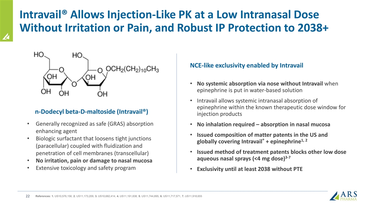 Intravail® Allows Injection-Like PK at a Low Intranasal Dose Without Irritation or Pain, and Robust IP Protection to 2038+ NCE-like exclusivity enabled by Intravail • No systemic absorption via nose without Intravail when epinephrine is put in water-based solution • Intravail allows systemic intranasal absorption of epinephrine within the known therapeutic dose window for n-Dodecyl beta-D-maltoside (Intravail®) injection products • Generally recognized as safe (GRAS) absorption • No inhalation required – absorption in nasal mucosa enhancing agent • Issued composition of matter patents in the US and • Biologic surfactant that loosens tight junctions ® 1, 2 globally covering Intravail + epinephrine (paracellular) coupled with fluidization and • Issued method of treatment patents blocks other low dose penetration of cell membranes (transcellular) 3-7 aqueous nasal sprays (<4 mg dose) • No irritation, pain or damage to nasal mucosa • Extensive toxicology and safety program • Exclusivity until at least 2038 without PTE References: 1. US10,576,156, 2. US11,173,209, 3. US10,682,414, 4. US11,191,838, 5. US11,744,895, 6. US11,717,571, 7. US11,918,655 22