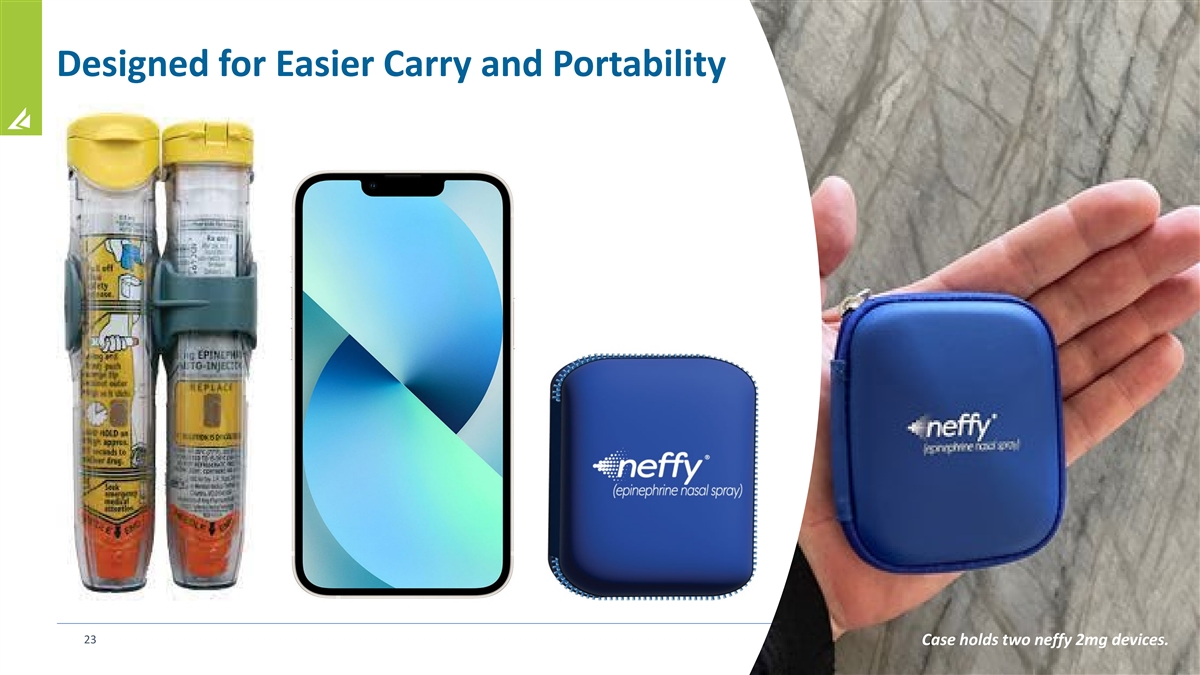 neffy is a High Bioavailability, Low 2 mg Dose Saline-Based Nasal Spray: Proven Triad of FDA-Approved Components High bioavailability with low dose minimizes side effects that mimic anaphylaxis (GI symptoms) > 9 FDA Approvals in Allergy and risk of cardiotoxicity from overdosing (> 100 years of clinical experience) Epinephrine 7 FDA Approvals of Sprayer 1 (> 55 million Rx, 99.999% reliable) 3 FDA Approvals incl. Intravail 1 (> 1 million Rx) ® ® ® NARCAN VALTOCO NAYZILAM ® ® ® TOSYMRA VALTOCO Intravail Sprayer ® ® ® ZAVZPRET dodecyl-maltoside: IMITREX TOSYMRA GRAS absorption enhancer ® OPVEE ® OPVEE 21 References: 1. IQVIA Prescription data, and ARS company data on file