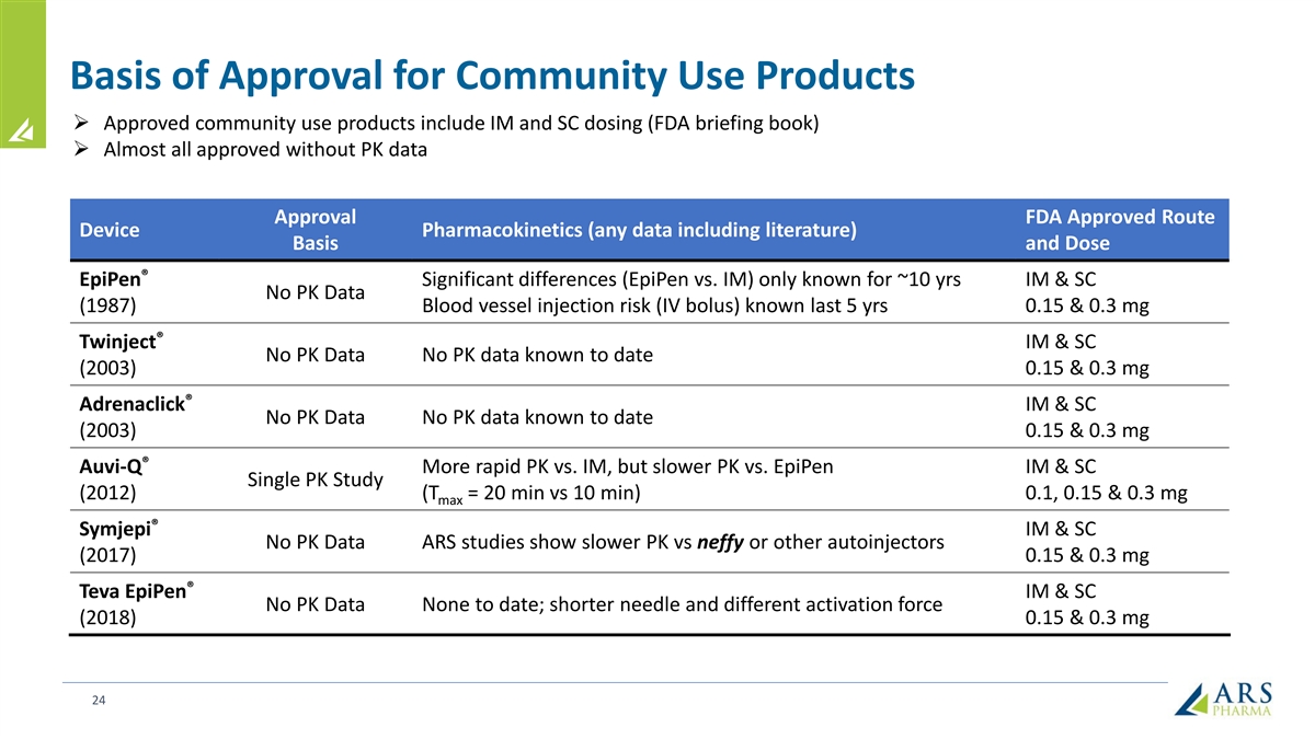 Basis of Approval for Community Use Products Ø Approved community use products include IM and SC dosing (FDA briefing book) Ø Almost all approved without PK data Approval FDA Approved Route Device Pharmacokinetics (any data including literature) Basis and Dose ® EpiPen Significant differences (EpiPen vs. IM) only known for ~10 yrs IM & SC No PK Data (1987) Blood vessel injection risk (IV bolus) known last 5 yrs 0.15 & 0.3 mg ® Twinject IM & SC No PK Data No PK data known to date (2003) 0.15 & 0.3 mg ® Adrenaclick IM & SC No PK Data No PK data known to date (2003) 0.15 & 0.3 mg ® Auvi-Q More rapid PK vs. IM, but slower PK vs. EpiPen IM & SC Single PK Study (2012) (T = 20 min vs 10 min) 0.1, 0.15 & 0.3 mg max ® Symjepi IM & SC No PK Data ARS studies show slower PK vs neffy or other autoinjectors (2017) 0.15 & 0.3 mg ® Teva EpiPen IM & SC No PK Data None to date; shorter needle and different activation force (2018) 0.15 & 0.3 mg 24