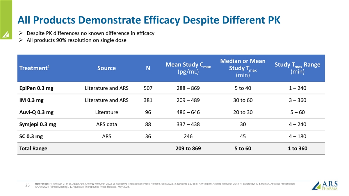 All Products Demonstrate Efficacy Despite Different PK Ø Despite PK differences no known difference in efficacy Ø All products 90% resolution on single dose Median or Mean Mean Study C Study T Range 1 max max Treatment Source N Study T max (pg/mL) (min) (min) EpiPen 0.3 mg Literature and ARS 507 288 – 869 5 to 40 1 – 240 IM 0.3 mg Literature and ARS 381 209 – 489 30 to 60 3 – 360 Auvi-Q 0.3 mg Literature 96 486 – 646 20 to 30 5 – 60 Symjepi 0.3 mg ARS data 88 337 – 438 30 4 – 240 SC 0.3 mg ARS 36 246 45 4 – 180 Total Range 209 to 869 5 to 60 1 to 360 References: 1. Srisiwat C, et al. Asian Pac J Allergy Immunol. 2022. 2. Aquestive Therapeutics Press Release. Sept 2022. 3. Edwards ES, et al. Ann Allergy Asthma Immunol. 2013. 4. Dworaczyk D & Hunt A. Abstract Presentation 25 AAAAI 2021 (Virtual Meeting). 5. Aquestive Therapeutics Press Release. May 2023.