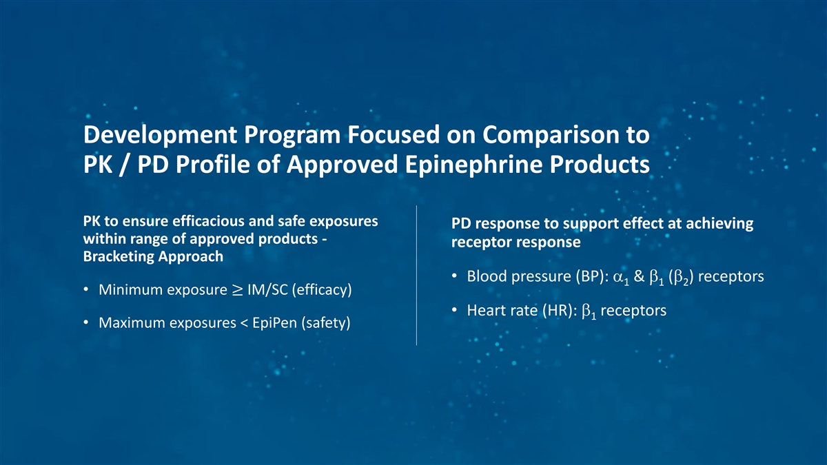 Development Program Focused on Comparison to PK / PD Profile of Approved Epinephrine Products PK to ensure efficacious and safe exposures PD response to support effect at achieving within range of approved products - receptor response Bracketing Approach • Blood pressure (BP): α & β (β ) receptors 1 1 2 • Minimum exposure ≥ IM/SC (efficacy) • Heart rate (HR): β receptors 1 • Maximum exposures < EpiPen (safety) 26