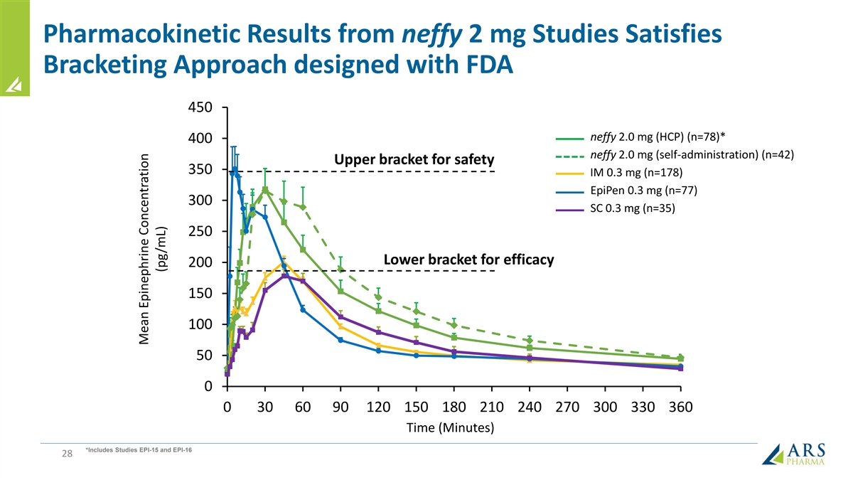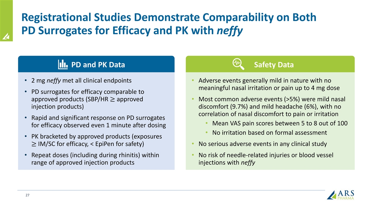 Registrational Studies Demonstrate Comparability on Both PD Surrogates for Efficacy and PK with neffy PD and PK Data Safety Data • 2 mg neffy met all clinical endpoints • Adverse events generally mild in nature with no meaningful nasal irritation or pain up to 4 mg dose • PD surrogates for efficacy comparable to approved products (SBP/HR ≥ approved • Most common adverse events (>5%) were mild nasal injection products) discomfort (9.7%) and mild headache (6%), with no correlation of nasal discomfort to pain or irritation • Rapid and significant response on PD surrogates • Mean VAS pain scores between 5 to 8 out of 100 for efficacy observed even 1 minute after dosing • No irritation based on formal assessment • PK bracketed by approved products (exposures ≥ IM/SC for efficacy, < EpiPen for safety) • No serious adverse events in any clinical study • Repeat doses (including during rhinitis) within • No risk of needle-related injuries or blood vessel range of approved injection products injections with neffy 27