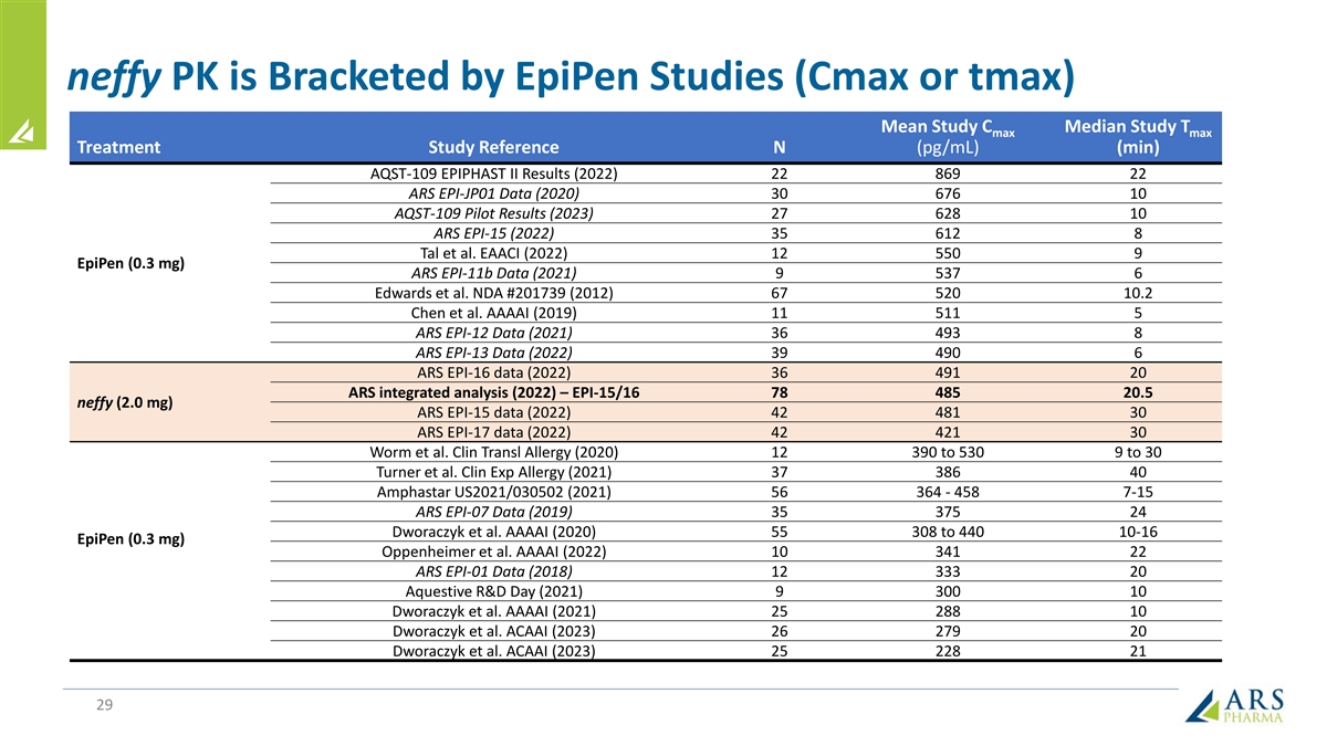 Pharmacokinetic Results from neffy 2 mg Studies Satisfies Bracketing Approach designed with FDA 450 neffy 2.0 mg (HCP) (n=78)* 400 neffy 2.0 mg (self-administration) (n=42) Upper bracket for safety 350 IM 0.3 mg (n=178) EpiPen 0.3 mg (n=77) 300 SC 0.3 mg (n=35) 250 Lower bracket for efficacy 200 150 100 50 0 0 30 60 90 120 150 180 210 240 270 300 330 360 Time (Minutes) *Includes Studies EPI-15 and EPI-16 28 Mean Epinephrine Concentration (pg/mL)