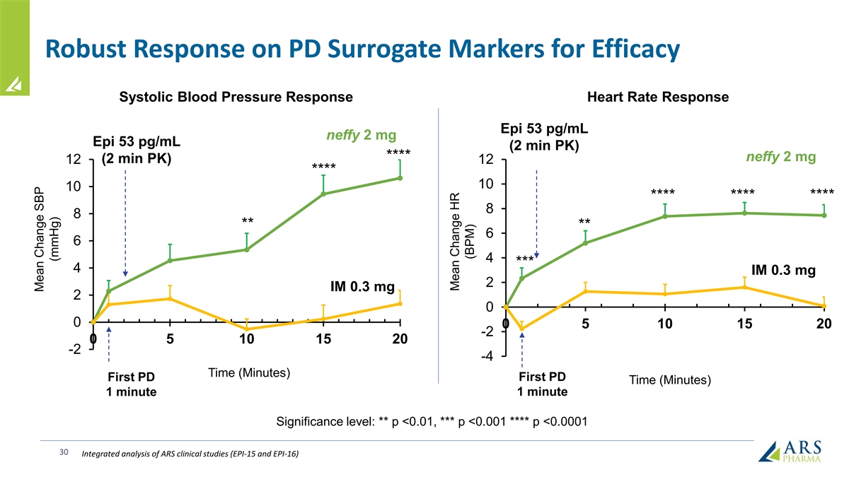 Robust Response on PD Surrogate Markers for Efficacy Systolic Blood Pressure Response Heart Rate Response Epi 53 pg/mL neffy 2 mg Epi 53 pg/mL (2 min PK) **** neffy 2 mg (2 min PK) 12 12 **** 10 10 **** **** **** 8 8 ** ** 6 6 4 *** 4 IM 0.3 mg 2 IM 0.3 mg 2 0 0 0 5 10 15 20 -2 0 5 10 15 20 -2 -4 Time (Minutes) First PD First PD Time (Minutes) 1 minute 1 minute Significance level: ** p <0.01, *** p <0.001 **** p <0.0001 30 Integrated analysis of ARS clinical studies (EPI-15 and EPI-16) Mean Change SBP (mmHg) Mean Change HR (BPM)