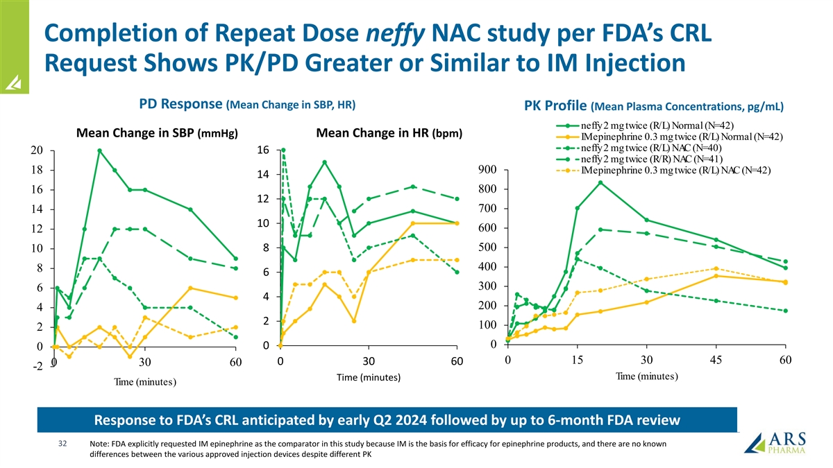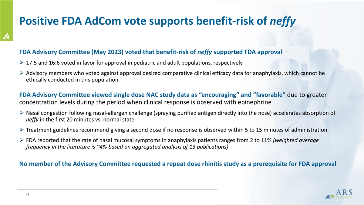 Positive FDA AdCom vote supports benefit-risk of neffy FDA Advisory Committee (May 2023) voted that benefit-risk of neffy supported FDA approval Ø 17:5 and 16:6 voted in favor for approval in pediatric and adult populations, respectively Ø Advisory members who voted against approval desired comparative clinical efficacy data for anaphylaxis, which cannot be ethically conducted in this population FDA Advisory Committee viewed single dose NAC study data as “encouraging” and “favorable” due to greater concentration levels during the period when clinical response is observed with epinephrine Ø Nasal congestion following nasal-allergen challenge (spraying purified antigen directly into the nose) accelerates absorption of neffy in the first 20 minutes vs. normal state Ø Treatment guidelines recommend giving a second dose if no response is observed within 5 to 15 minutes of administration Ø FDA reported that the rate of nasal mucosal symptoms in anaphylaxis patients ranges from 2 to 11% (weighted average frequency in the literature is ~4% based on aggregated analysis of 13 publications) No member of the Advisory Committee requested a repeat dose rhinitis study as a prerequisite for FDA approval 31