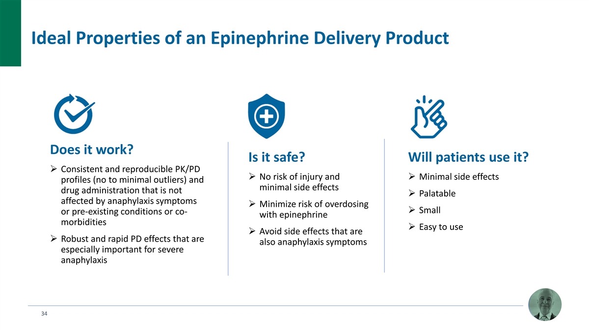 Ideal Properties of an Epinephrine Delivery Product Does it work? Is it safe? Will patients use it? Ø Consistent and reproducible PK/PD Ø No risk of injury and Ø Minimal side effects profiles (no to minimal outliers) and minimal side effects drug administration that is not Ø Palatable affected by anaphylaxis symptoms Ø Minimize risk of overdosing Ø Small or pre-existing conditions or co- with epinephrine morbidities Ø Easy to use Ø Avoid side effects that are Ø Robust and rapid PD effects that are also anaphylaxis symptoms especially important for severe anaphylaxis 34