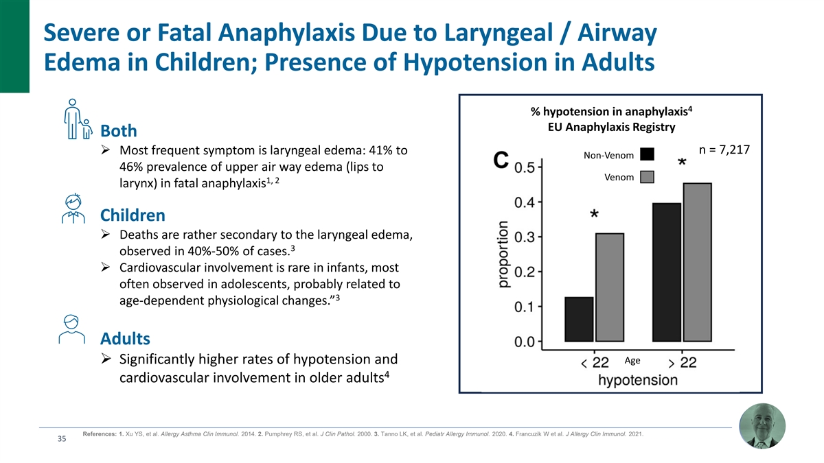 Severe or Fatal Anaphylaxis Due to Laryngeal / Airway Edema in Children; Presence of Hypotension in Adults 4 % hypotension in anaphylaxis EU Anaphylaxis Registry Both n = 7,217 Ø Most frequent symptom is laryngeal edema: 41% to Non-Venom 46% prevalence of upper air way edema (lips to Venom 1, 2 larynx) in fatal anaphylaxis Children Ø Deaths are rather secondary to the laryngeal edema, 3 observed in 40%-50% of cases. Ø Cardiovascular involvement is rare in infants, most often observed in adolescents, probably related to 3 age-dependent physiological changes.” Adults Age Ø Significantly higher rates of hypotension and 4 cardiovascular involvement in older adults References: 1. Xu YS, et al. Allergy Asthma Clin Immunol. 2014. 2. Pumphrey RS, et al. J Clin Pathol. 2000. 3. Tanno LK, et al. Pediatr Allergy Immunol. 2020. 4. Francuzik W et al. J Allergy Clin Immunol. 2021. 35