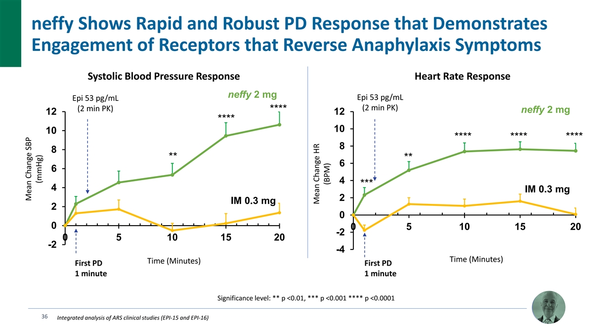 neffy Shows Rapid and Robust PD Response that Demonstrates Engagement of Receptors that Reverse Anaphylaxis Symptoms Systolic Blood Pressure Response Heart Rate Response neffy 2 mg Epi 53 pg/mL Epi 53 pg/mL (2 min PK) (2 min PK) **** neffy 2 mg 12 12 **** 10 10 **** **** **** 8 8 ** ** 6 6 4 *** 4 IM 0.3 mg 2 IM 0.3 mg 2 0 0 0 5 10 15 20 -2 0 5 10 15 20 -2 -4 Time (Minutes) Time (Minutes) First PD First PD 1 minute 1 minute Significance level: ** p <0.01, *** p <0.001 **** p <0.0001 36 Integrated analysis of ARS clinical studies (EPI-15 and EPI-16) Mean Change SBP (mmHg) Mean Change HR (BPM)
