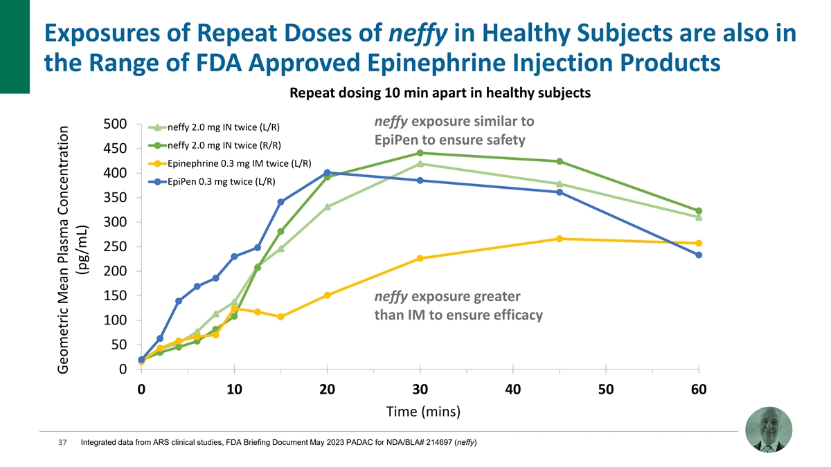 Exposures of Repeat Doses of neffy in Healthy Subjects are also in the Range of FDA Approved Epinephrine Injection Products Repeat dosing 10 min apart in healthy subjects neffy exposure similar to 500 neffy 2.0 mg IN twice (L/R) EpiPen to ensure safety neffy 2.0 mg IN twice (R/R) 450 Epinephrine 0.3 mg IM twice (L/R) 400 EpiPen 0.3 mg twice (L/R) 350 300 250 200 1.65x 150 neffy exposure greater than IM to ensure efficacy 100 50 0 0 10 20 30 40 50 60 Time (mins) 37 Integrated data from ARS clinical studies, FDA Briefing Document May 2023 PADAC for NDA/BLA# 214697 (neffy) Geometric Mean Plasma Concentration (pg/mL)