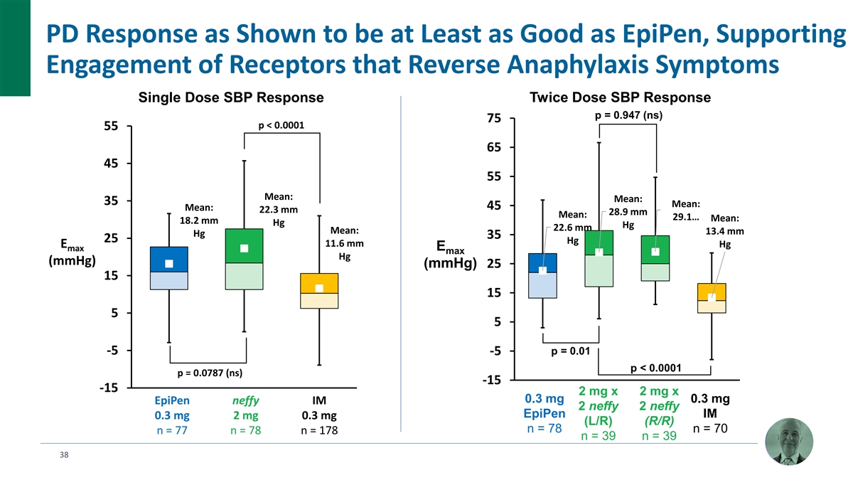 PD Response as Shown to be at Least as Good as EpiPen, Supporting Engagement of Receptors that Reverse Anaphylaxis Symptoms Single Dose SBP Response Twice Dose SBP Response p = 0.947 (ns) 75 p < 0.0001 55 65 45 55 Mean: Mean: 35 Mean: 45 Mean: 22.3 mm 28.9 mm Mean: 29.1 … Mean: 18.2 mm Hg Hg 22.6 mm Mean: 13.4 mm Hg 35 25 Hg 11.6 mm E Hg E max max Hg (mmHg) (mmHg) 25 15 15 5 5 -5 p = 0.01 -5 p < 0.0001 p = 0.0787 (ns) -15 -15 2 mg x 2 mg x 0.3 mg 0.3 mg EpiPen neffy IM 2 neffy 2 neffy EpiPen IM 0.3 mg 2 mg 0.3 mg (L/R) (R/R) n = 78 n = 70 n = 77 n = 78 n = 178 n = 39 n = 39 38