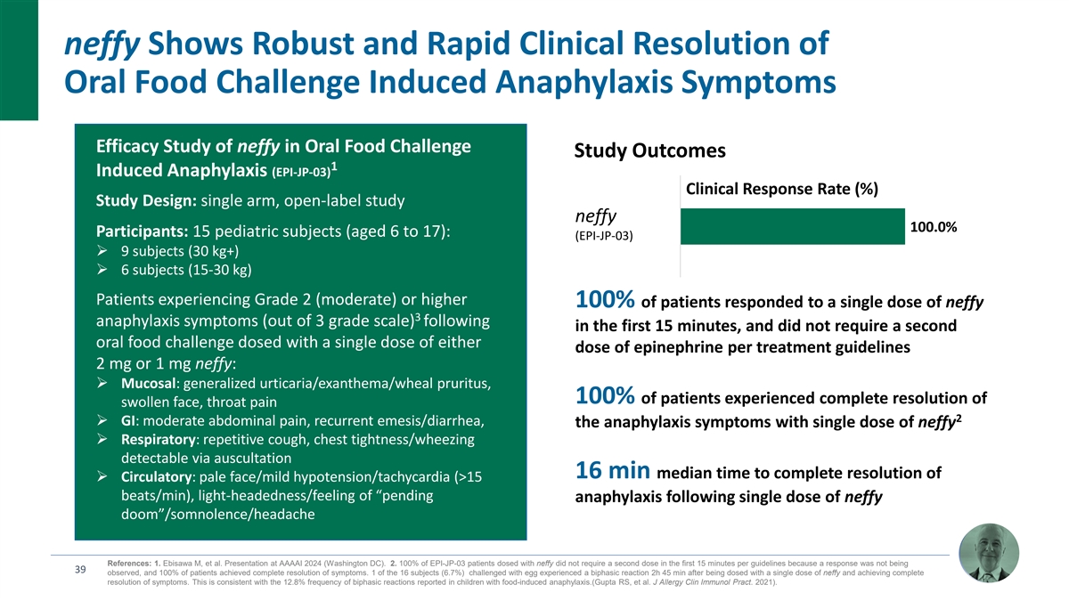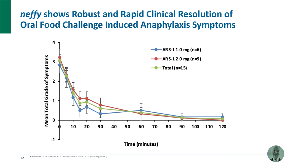 neffy shows Robust and Rapid Clinical Resolution of Oral Food Challenge Induced Anaphylaxis Symptoms References: 1. Ebisawa M, et al. Presentation at AAAAI 2024 (Washington DC). 40