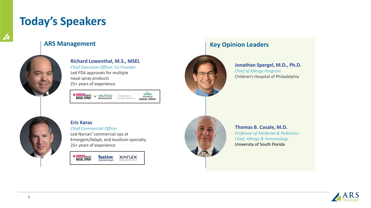 Today’s Speakers ARS Management Key Opinion Leaders Richard Lowenthal, M.S., MSEL Jonathan Spergel, M.D., Ph.D. Chief Executive Officer, Co-Founder Chief of Allergy Program Led FDA approvals for multiple Children’s Hospital of Philadelphia nasal spray products 25+ years of experience Eric Karas Thomas B. Casale, M.D. Chief Commercial Officer ® Professor of Medicine & Pediatrics Led Narcan commercial ops at Chief, Allergy & Immunology Emergent/Adapt, and Auxilium specialty University of South Florida 25+ years of experience 3