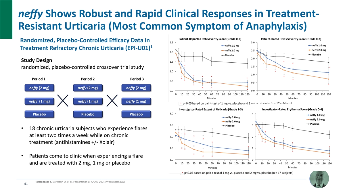 neffy Shows Robust and Rapid Clinical Responses in Treatment- Resistant Urticaria (Most Common Symptom of Anaphylaxis) Randomized, Placebo-Controlled Efficacy Data in 1 Treatment Refractory Chronic Urticaria (EPI-U01) Study Design randomized, placebo-controlled crossover trial study • 18 chronic urticaria subjects who experience flares at least two times a week while on chronic treatment (antihistamines +/- Xolair) • Patients come to clinic when experiencing a flare and are treated with 2 mg, 1 mg or placebo References: 1. Bernstein D, et al. Presentation at AAAAI 2024 (Washington DC). 41