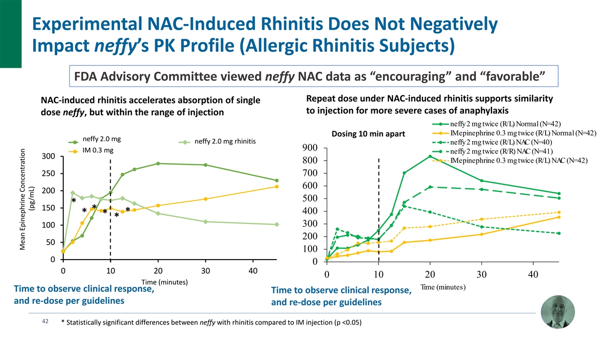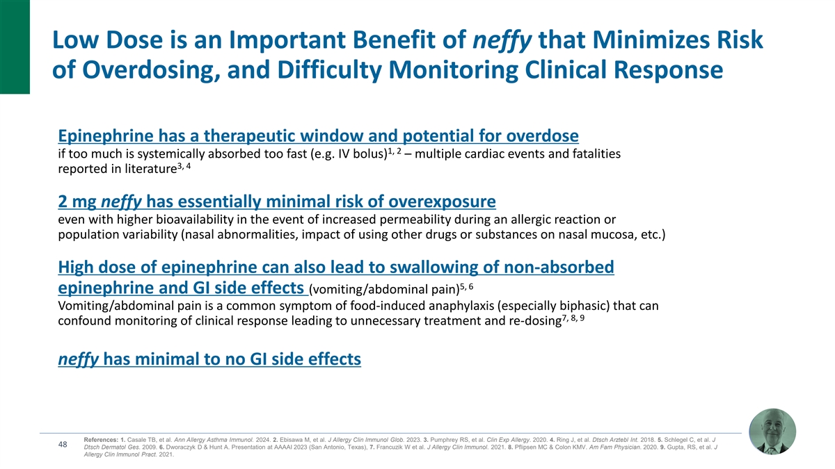 Low Dose is an Important Benefit of neffy that Minimizes Risk of Overdosing, and Difficulty Monitoring Clinical Response Epinephrine has a therapeutic window and potential for overdose 1, 2 if too much is systemically absorbed too fast (e.g. IV bolus) – multiple cardiac events and fatalities 3, 4 reported in literature 2 mg neffy has essentially minimal risk of overexposure even with higher bioavailability in the event of increased permeability during an allergic reaction or population variability (nasal abnormalities, impact of using other drugs or substances on nasal mucosa, etc.) High dose of epinephrine can also lead to swallowing of non-absorbed 5, 6 epinephrine and GI side effects (vomiting/abdominal pain) Vomiting/abdominal pain is a common symptom of food-induced anaphylaxis (especially biphasic) that can 7, 8, 9 confound monitoring of clinical response leading to unnecessary treatment and re-dosing neffy has minimal to no GI side effects References: 1. Casale TB, et al. Ann Allergy Asthma Immunol. 2024. 2. Ebisawa M, et al. J Allergy Clin Immunol Glob. 2023. 3. Pumphrey RS, et al. Clin Exp Allergy. 2020. 4. Ring J, et al. Dtsch Arztebl Int. 2018. 5. Schlegel C, et al. J 48 Dtsch Dermatol Ges. 2009. 6. Dworaczyk D & Hunt A. Presentation at AAAAI 2023 (San Antonio, Texas), 7. Francuzik W et al. J Allergy Clin Immunol. 2021. 8. Pflipsen MC & Colon KMV. Am Fam Physician. 2020. 9. Gupta, RS, et al. J Allergy Clin Immunol Pract. 2021.