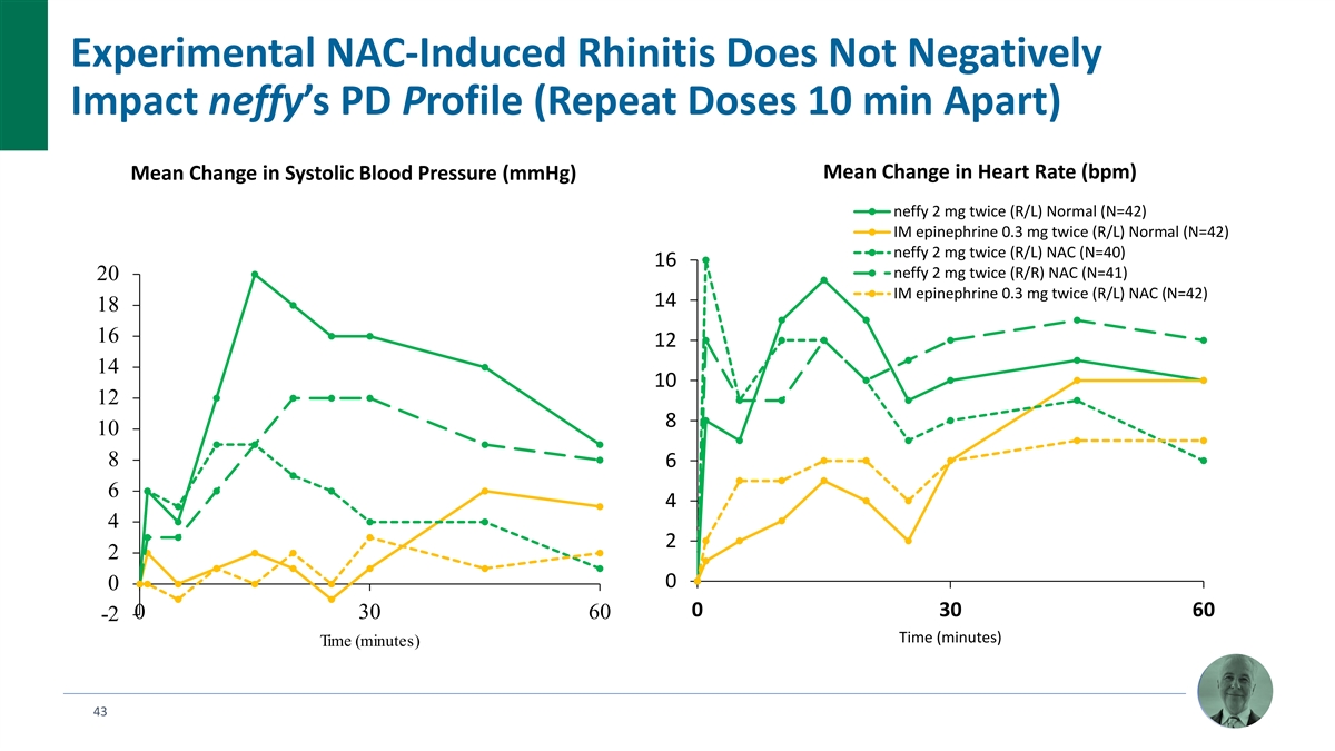 Experimental NAC-Induced Rhinitis Does Not Negatively Impact neffy’s PD Profile (Repeat Doses 10 min Apart) Mean Change in Heart Rate (bpm) Mean Change in Systolic Blood Pressure (mmHg) neffy 2 mg twice (R/L) Normal (N=42) IM epinephrine 0.3 mg twice (R/L) Normal (N=42) neffy 2 mg twice (R/L) NAC (N=40) 16 neffy 2 mg twice (R/R) NAC (N=41) 20 IM epinephrine 0.3 mg twice (R/L) NAC (N=42) 14 18 16 12 14 10 12 8 10 8 6 6 4 4 2 2 0 0 0 30 60 0 30 60 -2 Time (minutes) Time (minutes) 43