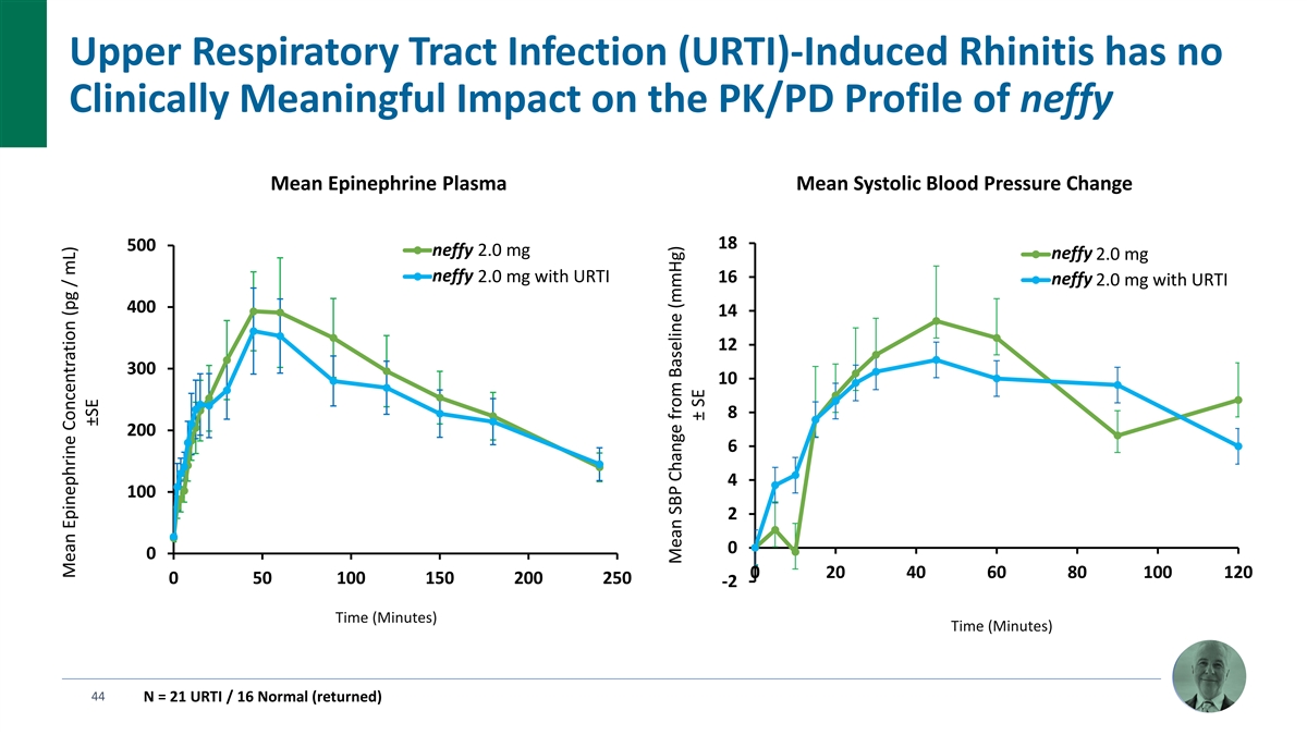 Upper Respiratory Tract Infection (URTI)-Induced Rhinitis has no Clinically Meaningful Impact on the PK/PD Profile of neffy Mean Epinephrine Plasma Mean Systolic Blood Pressure Change 18 500 n ne ef ff fy y 2.0 mg neffy neffy 2.0 mg neffy neffy 2.0 mg with URTI 16 neffy neffy 2.0 mg with URTI 400 14 12 300 10 8 200 6 4 100 2 0 0 0 20 40 60 80 100 120 0 50 100 150 200 250 -2 Time (Minutes) Time (Minutes) 44 N = 21 URTI / 16 Normal (returned) Mean Epinephrine Concentration (pg / mL) ±SE Mean SBP Change from Baseline (mmHg) ± SE