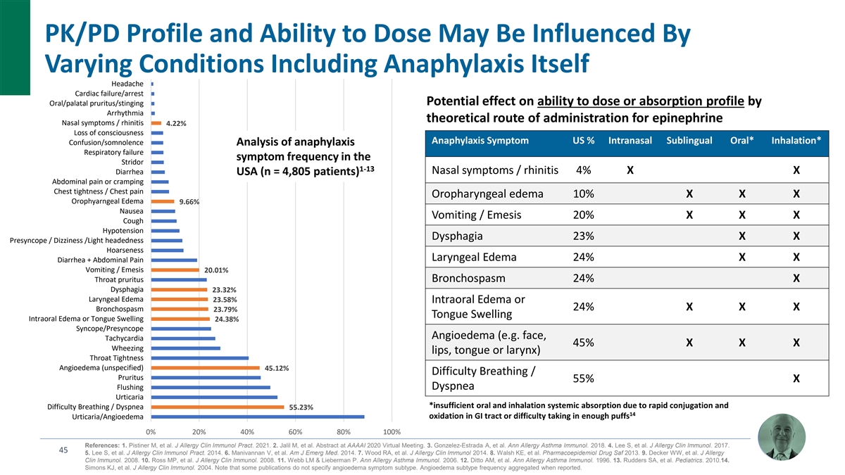 PK/PD Profile and Ability to Dose May Be Influenced By Varying Conditions Including Anaphylaxis Itself Headache Cardiac failure/arrest Oral/palatal pruritus/stinging Potential effect on ability to dose or absorption profile by Arrhythmia theoretical route of administration for epinephrine Nasal symptoms / rhinitis 4.22% Loss of consciousness Anaphylaxis Symptom US % Intranasal Sublingual Oral* Inhalation* Confusion/somnolence Analysis of anaphylaxis Respiratory failure symptom frequency in the Stridor 1-13 Diarrhea Nasal symptoms / rhinitis 4% X X USA (n = 4,805 patients) Abdominal pain or cramping Chest tightness / Chest pain Oropharyngeal edema 10% X X X Orophyarngeal Edema 9.66% Nausea Vomiting / Emesis 20% X X X Cough Hypotension Dysphagia 23% X X Presyncope / Dizziness /Light headedness Hoarseness Laryngeal Edema 24% X X Diarrhea + Abdominal Pain Vomiting / Emesis 20.01% Throat pruritus Bronchospasm 24% X Dysphagia 23.32% Laryngeal Edema 23.58% Intraoral Edema or 24% X X X Bronchospasm 23.79% Tongue Swelling Intraoral Edema or Tongue Swelling 24.38% Syncope/Presyncope Angioedema (e.g. face, Tachycardia 45% X X X Wheezing lips, tongue or larynx) Throat Tightness Angioedema (unspecified) 45.12% Difficulty Breathing / Pruritus 55% X Flushing Dyspnea Urticaria *insufficient oral and inhalation systemic absorption due to rapid conjugation and Difficulty Breathing / Dyspnea 55.23% 14 oxidation in GI tract or difficulty taking in enough puffs Urticaria/Angioedema 0% 20% 40% 60% 80% 100% References: 1. Pistiner M, et al. J Allergy Clin Immunol Pract. 2021. 2. Jalil M, et al. Abstract at AAAAI 2020 Virtual Meeting. 3. Gonzelez-Estrada A, et al. Ann Allergy Asthma Immunol. 2018. 4. Lee S, et al. J Allergy Clin Immunol. 2017. 45 5. Lee S, et al. J Allergy Clin Immunol Pract. 2014. 6. Manivannan V, et al. Am J Emerg Med. 2014. 7. Wood RA, et al. J Allergy Clin Immunol 2014. 8. Walsh KE, et al. Pharmacoepidemiol Drug Saf 2013. 9. Decker WW, et al. J Allergy Clin Immunol. 2008. 10. Ross MP, et al. J Allergy Clin Immunol. 2008. 11. Webb LM & Lieberman P. Ann Allergy Asthma Immunol. 2006. 12. Ditto AM, et al. Ann Allergy Asthma Immunol. 1996. 13. Rudders SA, et al. Pediatrics. 2010.14. Simons KJ, et al. J Allergy Clin Immunol. 2004. Note that some publications do not specify angioedema symptom subtype. Angioedema subtype frequency aggregated when reported.
