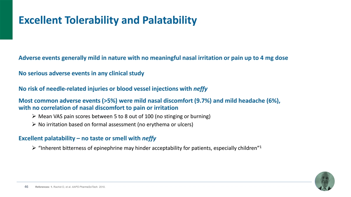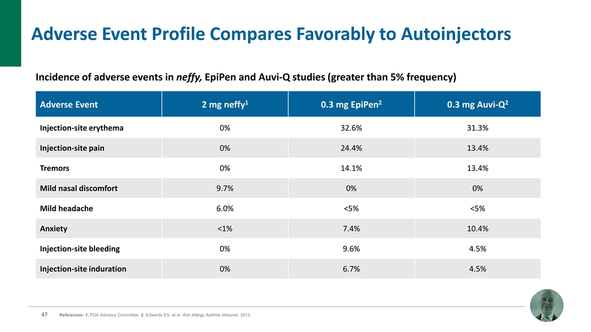 Excellent Tolerability and Palatability Adverse events generally mild in nature with no meaningful nasal irritation or pain up to 4 mg dose No serious adverse events in any clinical study No risk of needle-related injuries or blood vessel injections with neffy Most common adverse events (>5%) were mild nasal discomfort (9.7%) and mild headache (6%), with no correlation of nasal discomfort to pain or irritation Ø Mean VAS pain scores between 5 to 8 out of 100 (no stinging or burning) Ø No irritation based on formal assessment (no erythema or ulcers) Excellent palatability – no taste or smell with neffy 1 Ø “Inherent bitterness of epinephrine may hinder acceptability for patients, especially children” 46 References: 1. Rachid O, et al. AAPS PharmaSciTech. 2010.