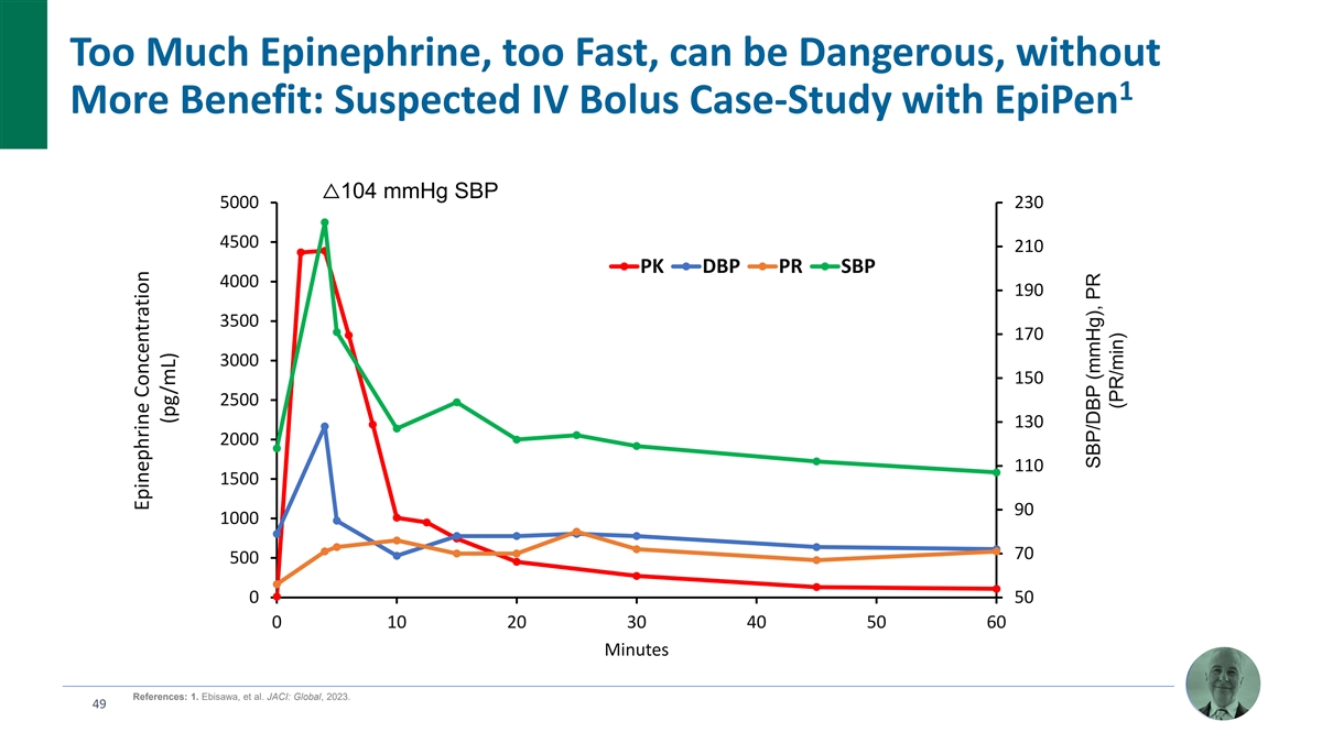 Too Much Epinephrine, too Fast, can be Dangerous, without 1 More Benefit: Suspected IV Bolus Case-Study with EpiPen △104 mmHg SBP 5000 230 4500 210 PK DBP PR SBP 4000 190 3500 170 3000 150 2500 130 2000 110 1500 90 1000 70 500 0 50 0 10 20 30 40 50 60 Minutes References: 1. Ebisawa, et al. JACI: Global, 2023. 49 Epinephrine Concentration (pg/mL) SBP/DBP (mmHg), PR (PR/min)