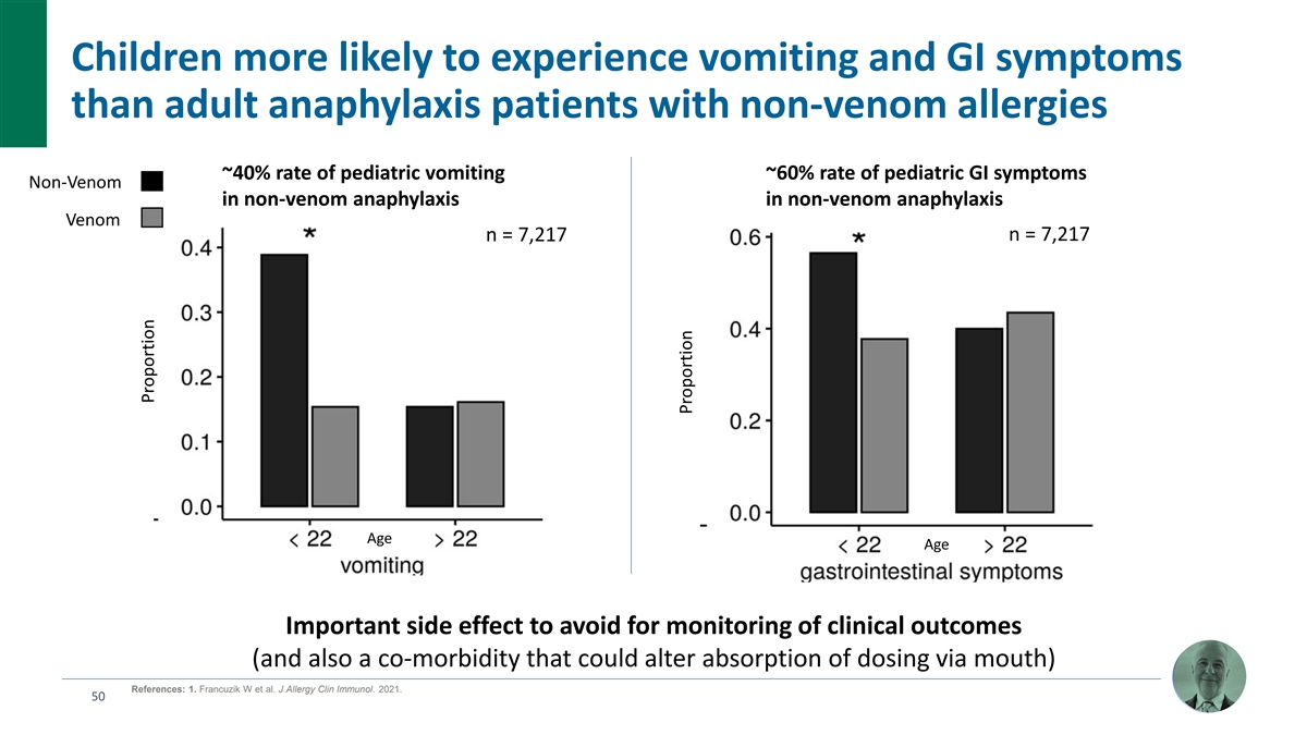 Children more likely to experience vomiting and GI symptoms than adult anaphylaxis patients with non-venom allergies ~40% rate of pediatric vomiting ~60% rate of pediatric GI symptoms Non-Venom in non-venom anaphylaxis in non-venom anaphylaxis Venom n = 7,217 n = 7,217 Age Age Important side effect to avoid for monitoring of clinical outcomes (and also a co-morbidity that could alter absorption of dosing via mouth) References: 1. Francuzik W et al. J Allergy Clin Immunol. 2021. 50 Proportion Proportion
