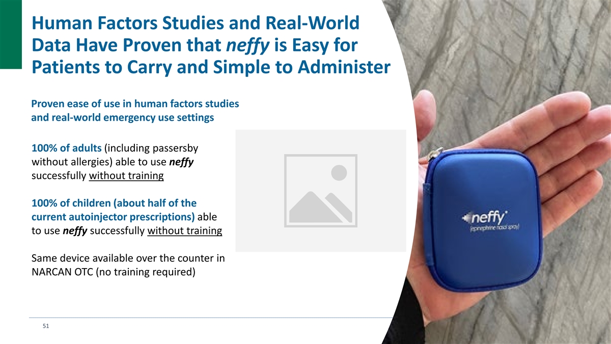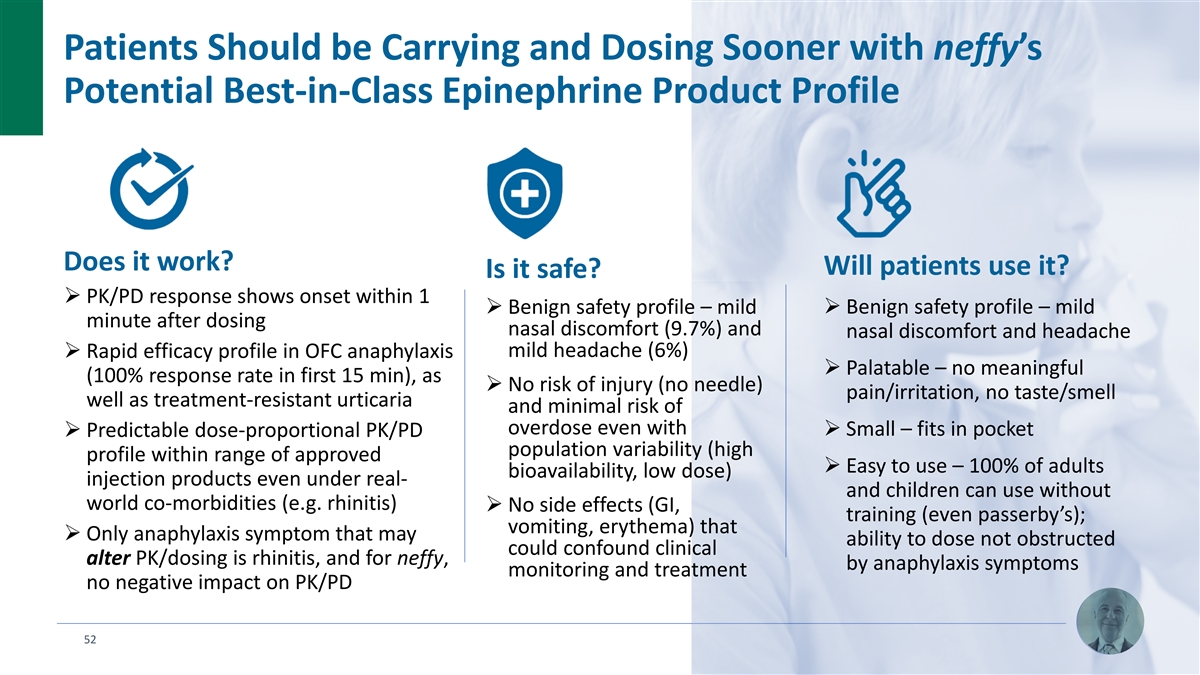 Human Factors Studies and Real-World Data Have Proven that neffy is Easy for Patients to Carry and Simple to Administer Proven ease of use in human factors studies and real-world emergency use settings 100% of adults (including passersby without allergies) able to use neffy successfully without training 100% of children (about half of the current autoinjector prescriptions) able to use neffy successfully without training Same device available over the counter in NARCAN OTC (no training required) 51