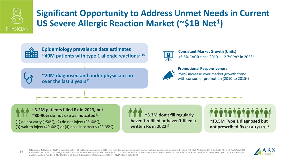 Significant Opportunity to Address Unmet Needs in Current 1 US Severe Allergic Reaction Market (~$1B Net ) PHYSICIAN Epidemiology prevalence data estimates Consistent Market Growth (Units) 2-10 1 ~40M patients with type 1 allergic reactions +6.5% CAGR since 2010, +12.7% YoY in 2023 Promotional Responsiveness ~50% increase over market growth trend ~20M diagnosed and under physician care 1 with consumer promotion (2010 to 2015 ) 11 over the last 3 years ~3.2M patients filled Rx in 2023, but 11 ~3.3M don’t fill regularly, ~80-90% do not use as indicated haven’t refilled or haven’t filled a ~13.5M Type 1 diagnosed but (1) do not carry (~50%), (2) do not inject (25-60%), 11 11 written Rx in 2022 (3) wait to inject (40-60%) or (4) dose incorrectly (23-35%) not prescribed Rx (past 3 years) References: 1. Based on IQVIA prescription data (~5.2 million two-packs sold in 2023) and weighted average generic/branded epinephrine auto-injector net pricing. 2. Gupta RS, et al. Pediatrics. 2011. 4. Gupta RS, et al. Pediatrics 2018. 54 5. McGowan EC, et al. J Clin Allergy Immunol. 2013. 6. Jackson KD, et al. NCHS Data Brief. 2013. 7. Black LI, et al. CDC National Center for Health Statistics Data Brief. 2019. 8. Gupta RS, et al. JAMA Netw Open. 2019. 9. Verrill L, et al. Allergy Asthma Pro. 2015. 10. Bilo BM, et al. Current Opin Allergy Clin Immunol. 2008. 11. IQVIA Claims Data, 2023