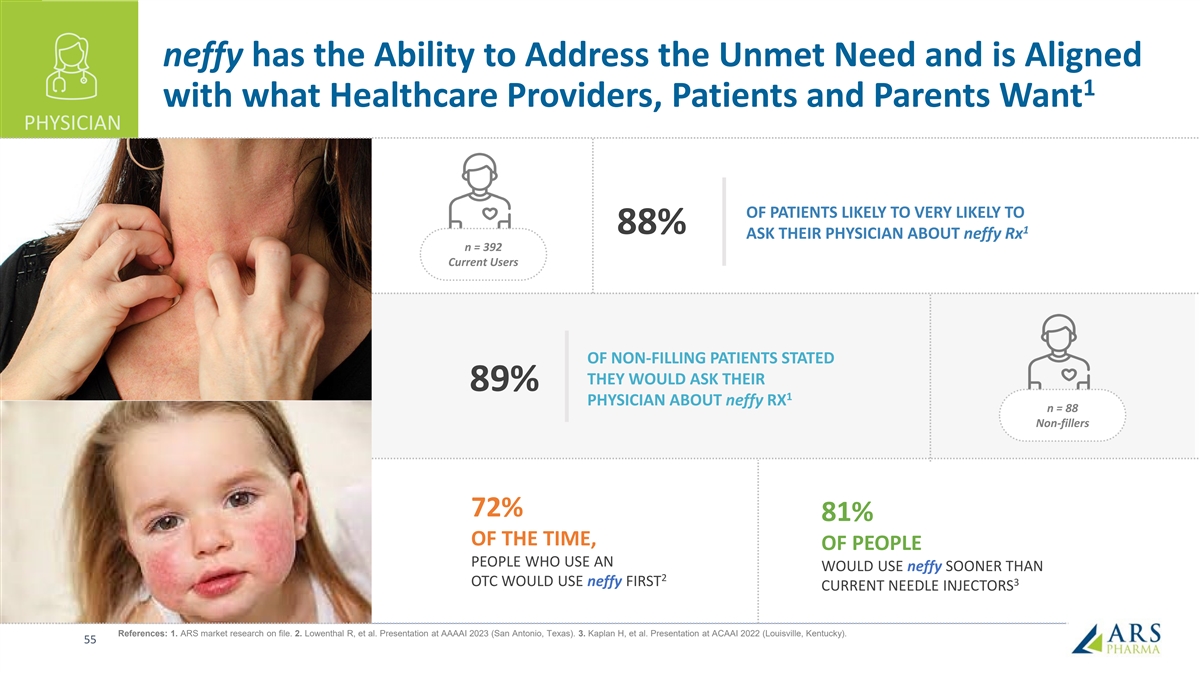 neffy has the Ability to Address the Unmet Need and is Aligned 1 with what Healthcare Providers, Patients and Parents Want PHYSICIAN OF PATIENTS LIKELY TO VERY LIKELY TO 88% 1 ASK THEIR PHYSICIAN ABOUT neffy Rx n = 392 Current Users OF NON-FILLING PATIENTS STATED THEY WOULD ASK THEIR 89% 1 PHYSICIAN ABOUT neffy RX n = 88 Non-fillers 72% 81% OF THE TIME, OF PEOPLE PEOPLE WHO USE AN WOULD USE neffy SOONER THAN 2 OTC WOULD USE neffy FIRST 3 CURRENT NEEDLE INJECTORS References: 1. ARS market research on file. 2. Lowenthal R, et al. Presentation at AAAAI 2023 (San Antonio, Texas). 3. Kaplan H, et al. Presentation at ACAAI 2022 (Louisville, Kentucky). 55