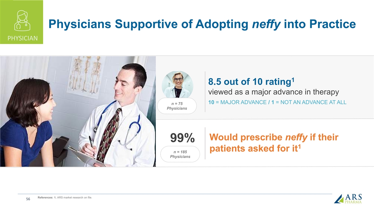 Physicians Supportive of Adopting neffy into Practice PHYSICIAN 1 8.5 out of 10 rating viewed as a major advance in therapy 10 = MAJOR ADVANCE / 1 = NOT AN ADVANCE AT ALL n = 75 Physicians Would prescribe neffy if their 99% 1 patients asked for it n = 185 Physicians References: 1. ARS market research on file. 56