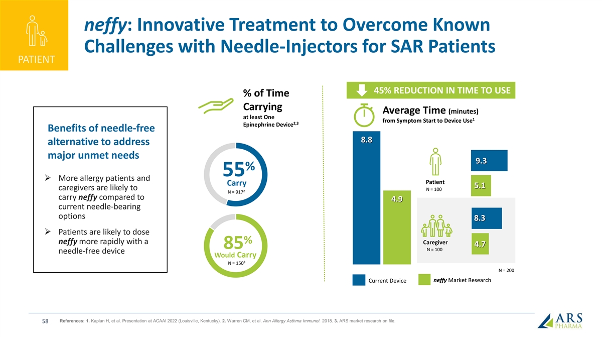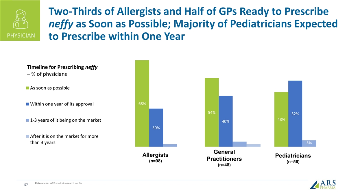 Two-Thirds of Allergists and Half of GPs Ready to Prescribe neffy as Soon as Possible; Majority of Pediatricians Expected PHYSICIAN to Prescribe within One Year Timeline for Prescribing neffy – % of physicians As soon as possible 68% Within one year of its approval 54% 52% 43% 1-3 years of it being on the market 40% 30% After it is on the market for more than 3 years 5% General Allergists Pediatricians Practitioners (n=98) (n=56) (n=48) References: ARS market research on file. 57