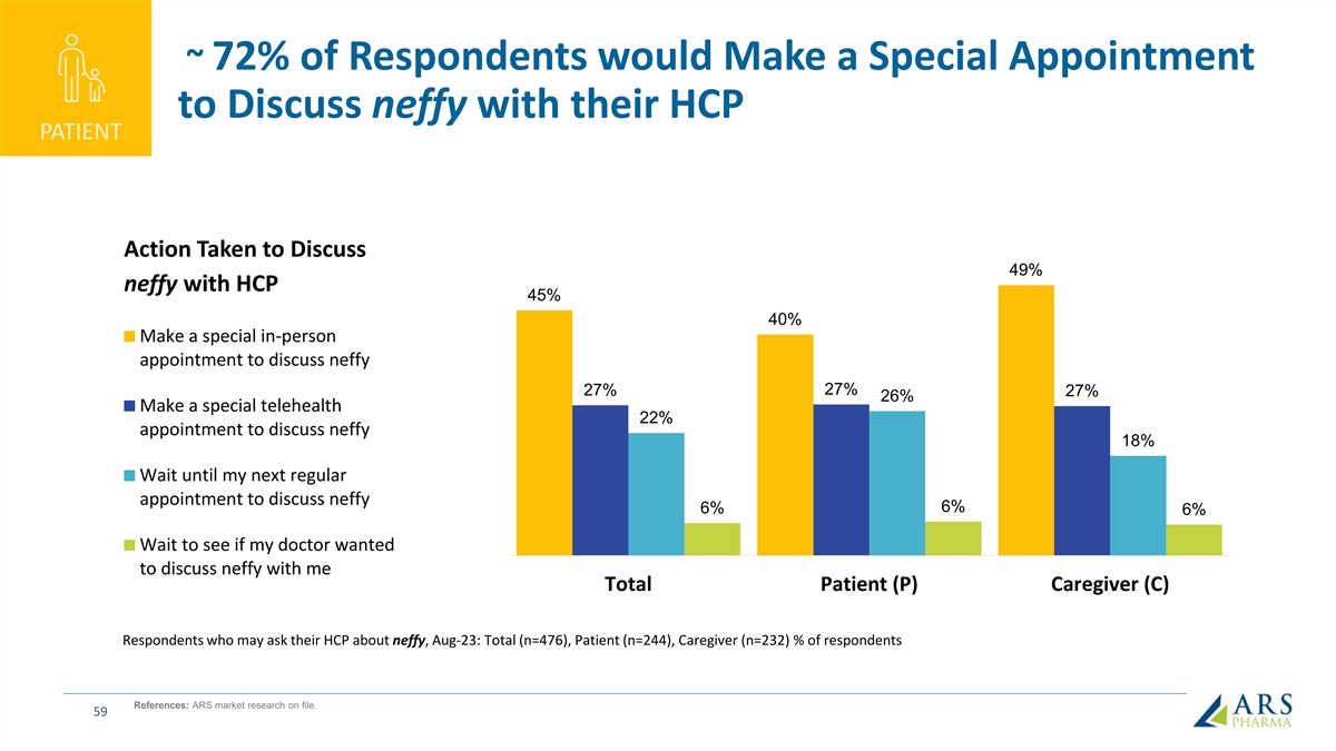 ~ 72% of Respondents would Make a Special Appointment to Discuss neffy with their HCP PATIENT Action Taken to Discuss 49% neffy with HCP 45% 40% Make a special in-person appointment to discuss neffy 27% 27% 27% 26% Make a special telehealth 22% appointment to discuss neffy 18% Wait until my next regular appointment to discuss neffy 6% 6% 6% Wait to see if my doctor wanted to discuss neffy with me Total Patient (P) Caregiver (C) Respondents who may ask their HCP about neffy, Aug-23: Total (n=476), Patient (n=244), Caregiver (n=232) % of respondents References: ARS market research on file. 59
