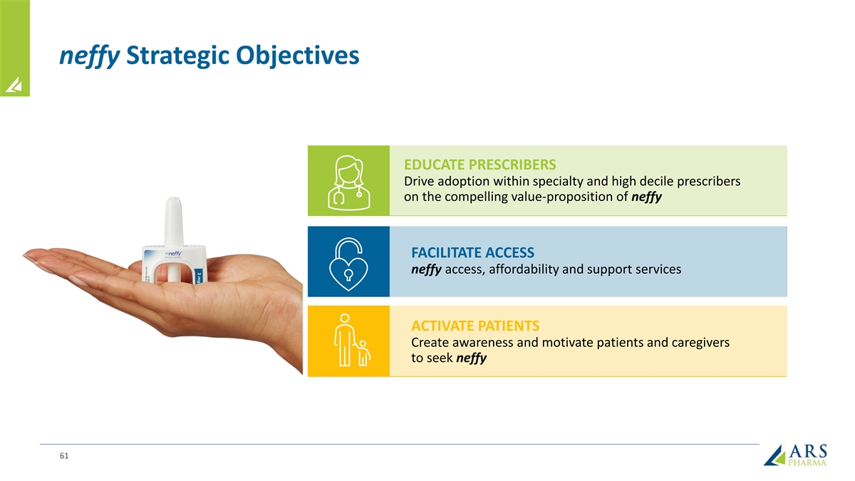 neffy Strategic Objectives EDUCATE PRESCRIBERS Drive adoption within specialty and high decile prescribers on the compelling value-proposition of neffy FACILITATE ACCESS neffy access, affordability and support services ACTIVATE PATIENTS Create awareness and motivate patients and caregivers to seek neffy 61