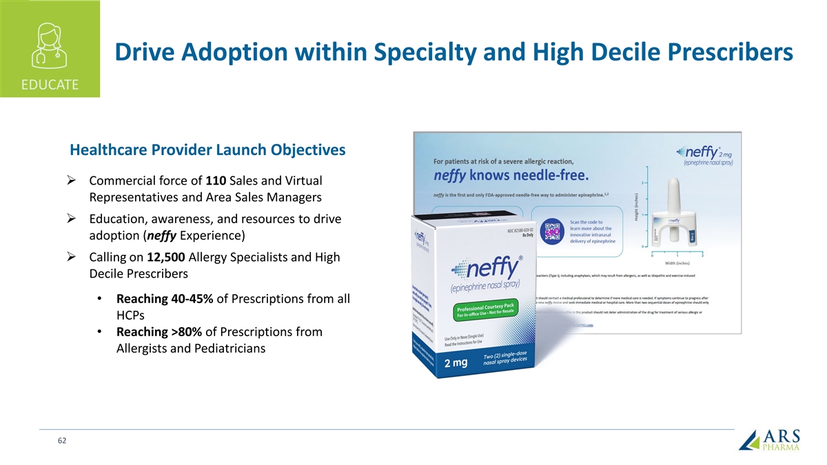 Drive Adoption within Specialty and High Decile Prescribers EDUCATE Healthcare Provider Launch Objectives Ø Commercial force of 110 Sales and Virtual Representatives and Area Sales Managers Ø Education, awareness, and resources to drive adoption (neffy Experience) Ø Calling on 12,500 Allergy Specialists and High Decile Prescribers • Reaching 40-45% of Prescriptions from all HCPs • Reaching >80% of Prescriptions from Allergists and Pediatricians 62