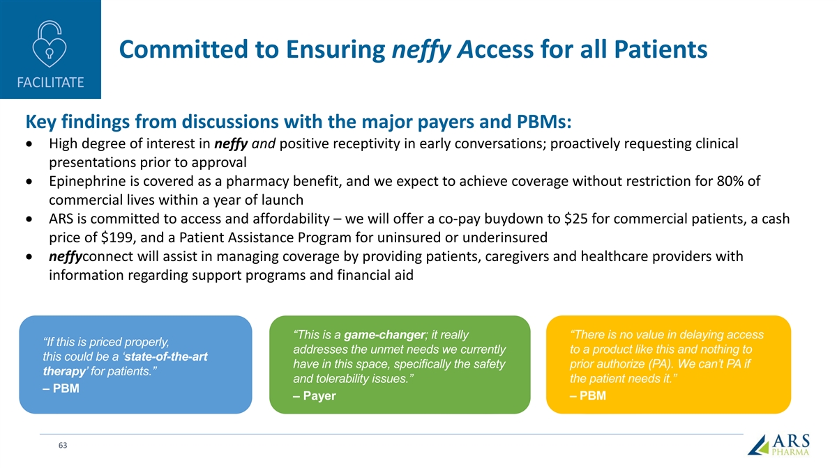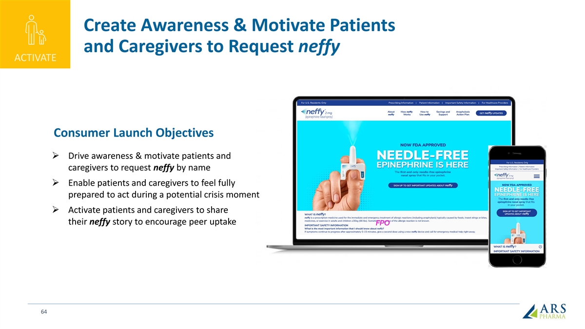 Committed to Ensuring neffy Access for all Patients FACILITATE Key findings from discussions with the major payers and PBMs: • High degree of interest in neffy and positive receptivity in early conversations; proactively requesting clinical presentations prior to approval • Epinephrine is covered as a pharmacy benefit, and we expect to achieve coverage without restriction for 80% of commercial lives within a year of launch • ARS is committed to access and affordability – we will offer a co-pay buydown to $25 for commercial patients, a cash price of $199, and a Patient Assistance Program for uninsured or underinsured • neffyconnect will assist in managing coverage by providing patients, caregivers and healthcare providers with information regarding support programs and financial aid “This is a game-changer; it really “There is no value in delaying access “If this is priced properly, addresses the unmet needs we currently to a product like this and nothing to this could be a ‘state-of-the-art have in this space, specifically the safety prior authorize (PA). We can’t PA if therapy’ for patients.” and tolerability issues.” the patient needs it.” – PBM – Payer – PBM 63