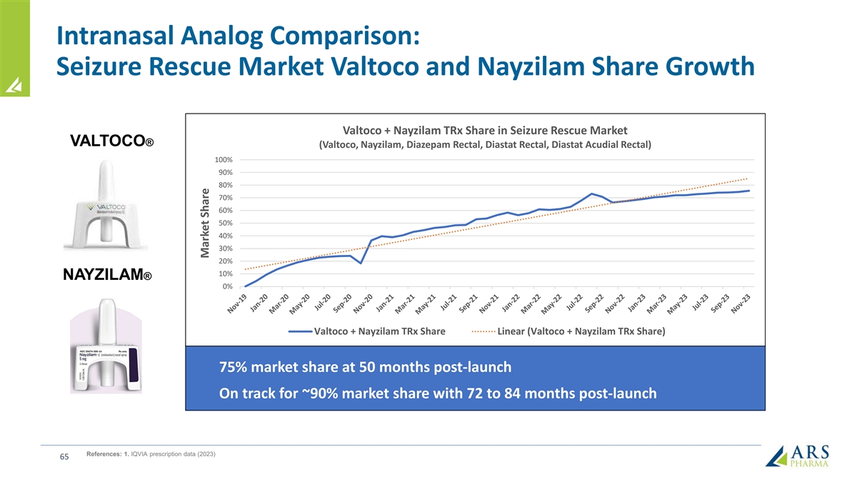 Intranasal Analog Comparison: Seizure Rescue Market Valtoco and Nayzilam Share Growth Valtoco + Nayzilam TRx Share in Seizure Rescue Market VALTOCO® (Valtoco, Nayzilam, Diazepam Rectal, Diastat Rectal, Diastat Acudial Rectal) 100% 90% 80% 70% 60% 50% 40% 30% 20% 10% NAYZILAM® 0% Valtoco + Nayzilam TRx Share Linear (Valtoco + Nayzilam TRx Share) 75% market share at 50 months post-launch On track for ~90% market share with 72 to 84 months post-launch References: 1. IQVIA prescription data (2023) 65 Market Share