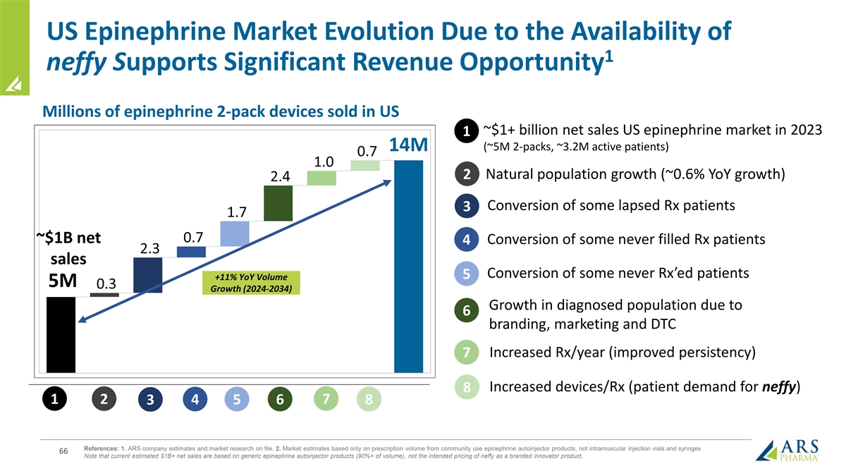 US Epinephrine Market Evolution Due to the Availability of 1 neffy Supports Significant Revenue Opportunity Millions of epinephrine 2-pack devices sold in US ~$1+ billion net sales US epinephrine market in 2023 1 (~5M 2-packs, ~3.2M active patients) 14M 2 Natural population growth (~0.6% YoY growth) Conversion of some lapsed Rx patients 3 ~$1B net Conversion of some never filled Rx patients 4 sales Conversion of some never Rx’ed patients 5 +11% YoY Volume 5M Growth (2024-2034) Growth in diagnosed population due to 6 branding, marketing and DTC Increased Rx/year (improved persistency) 7 Increased devices/Rx (patient demand for neffy) 8 1 2 7 3 4 5 6 8 References: 1. ARS company estimates and market research on file. 2. Market estimates based only on prescription volume from community use epinephrine autoinjector products, not intramuscular injection vials and syringes 66 Note that current estimated $1B+ net sales are based on generic epinephrine autoinjector products (90%+ of volume), not the intended pricing of neffy as a branded innovator product.