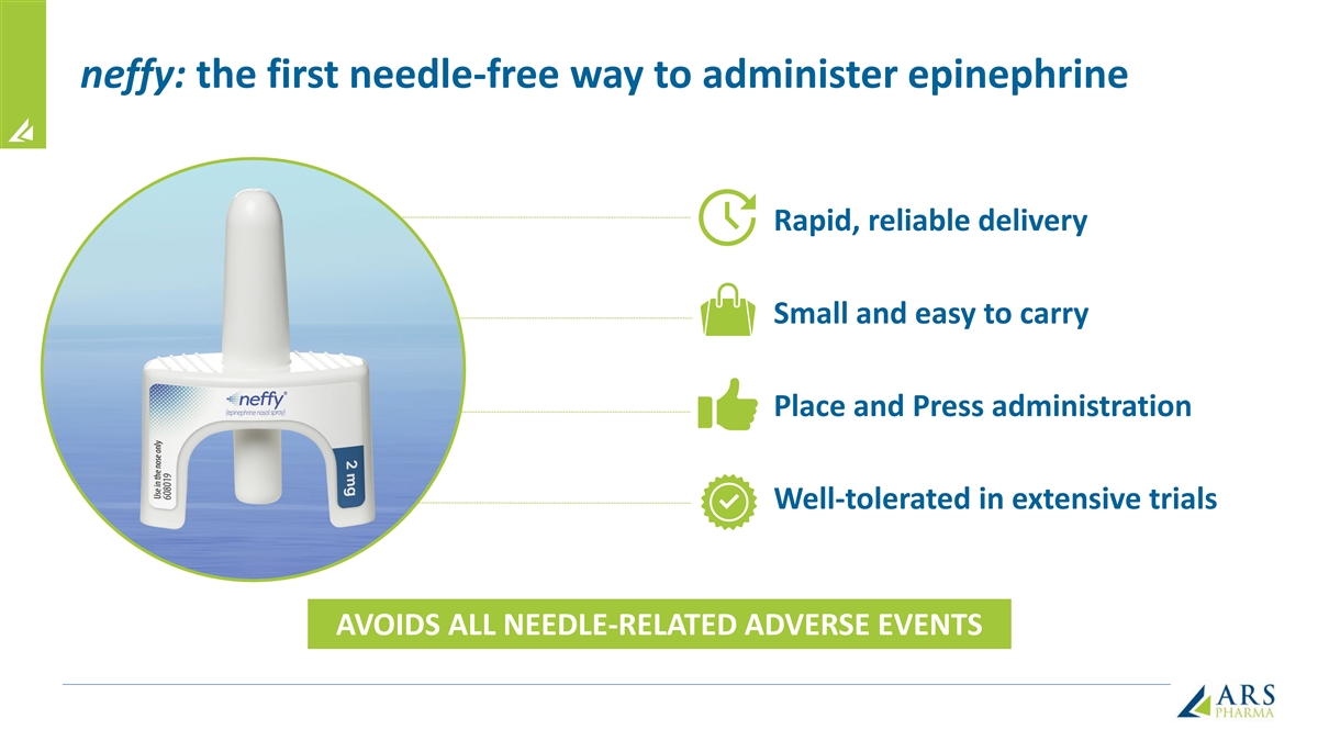 neffy: the first needle-free way to administer epinephrine Rapid, reliable delivery Small and easy to carry Place and Press administration Well-tolerated in extensive trials AVOIDS ALL NEEDLE-RELATED ADVERSE EVENTS