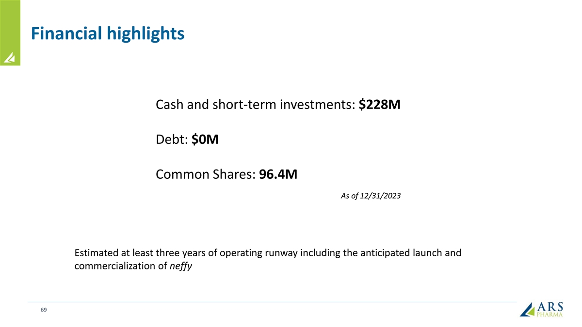 Financial highlights Cash and short-term investments: $228M Debt: $0M Common Shares: 96.4M As of 12/31/2023 Estimated at least three years of operating runway including the anticipated launch and commercialization of neffy 69