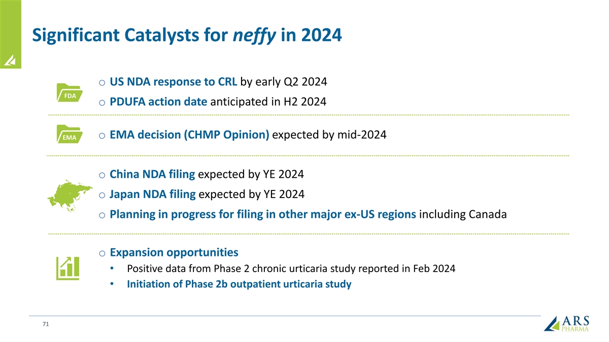 Significant Catalysts for neffy in 2024 o US NDA response to CRL by early Q2 2024 FDA o PDUFA action date anticipated in H2 2024 o EMA decision (CHMP Opinion) expected by mid-2024 EMA o China NDA filing expected by YE 2024 o Japan NDA filing expected by YE 2024 o Planning in progress for filing in other major ex-US regions including Canada o Expansion opportunities • Positive data from Phase 2 chronic urticaria study reported in Feb 2024 • Initiation of Phase 2b outpatient urticaria study 71