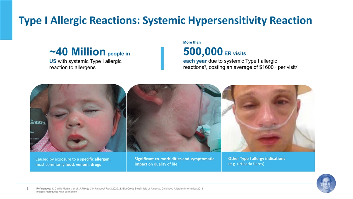 Type I Allergic Reactions: Systemic Hypersensitivity Reaction More than 500,000 ER visits ~40 Million people in each year due to systemic Type I allergic US with systemic Type I allergic 1 2 reactions , costing an average of $1600+ per visit reaction to allergens Other Type I allergy indications Significant co-morbidities and symptomatic Caused by exposure to a specific allergen, (e.g. urticaria flares) impact on quality of life. most commonly food, venom, drugs References: 1. Carillo-Martin I, et al. J Allergy Clin Immunol Pract 2020. 2. BlueCross BlueShield of America. Childhood Allergies in America 2018 9 Images reproduced with permission