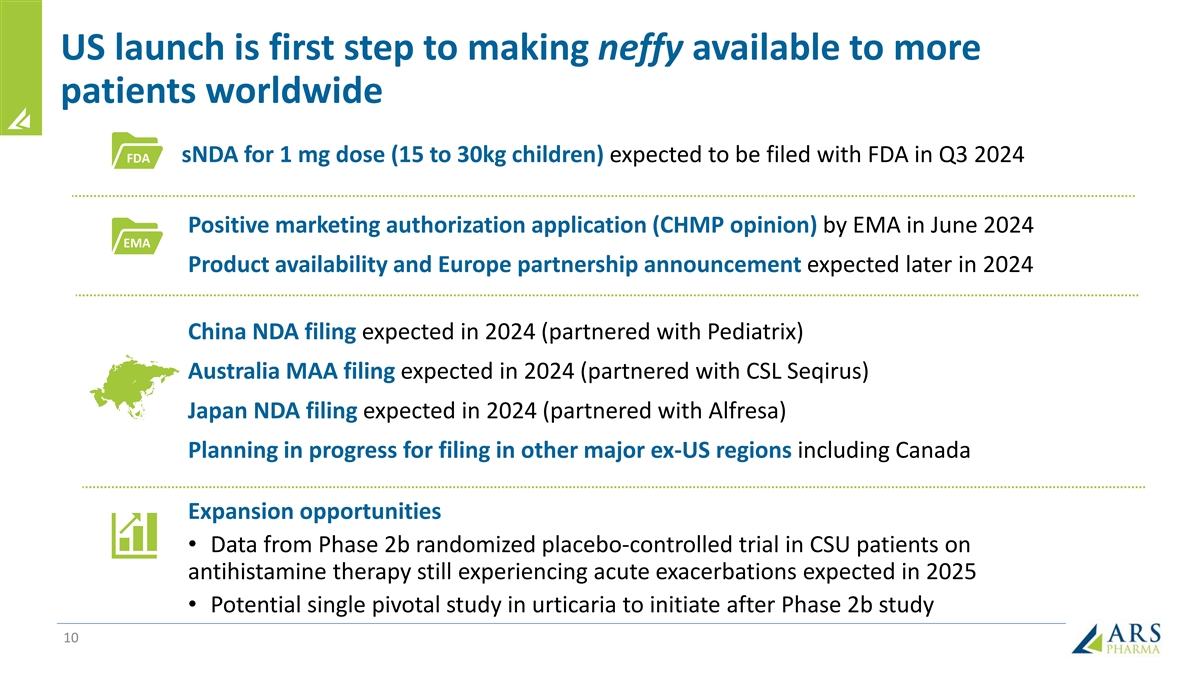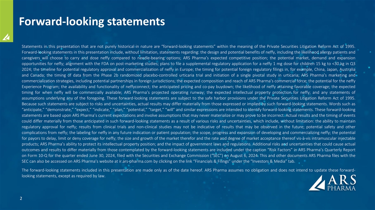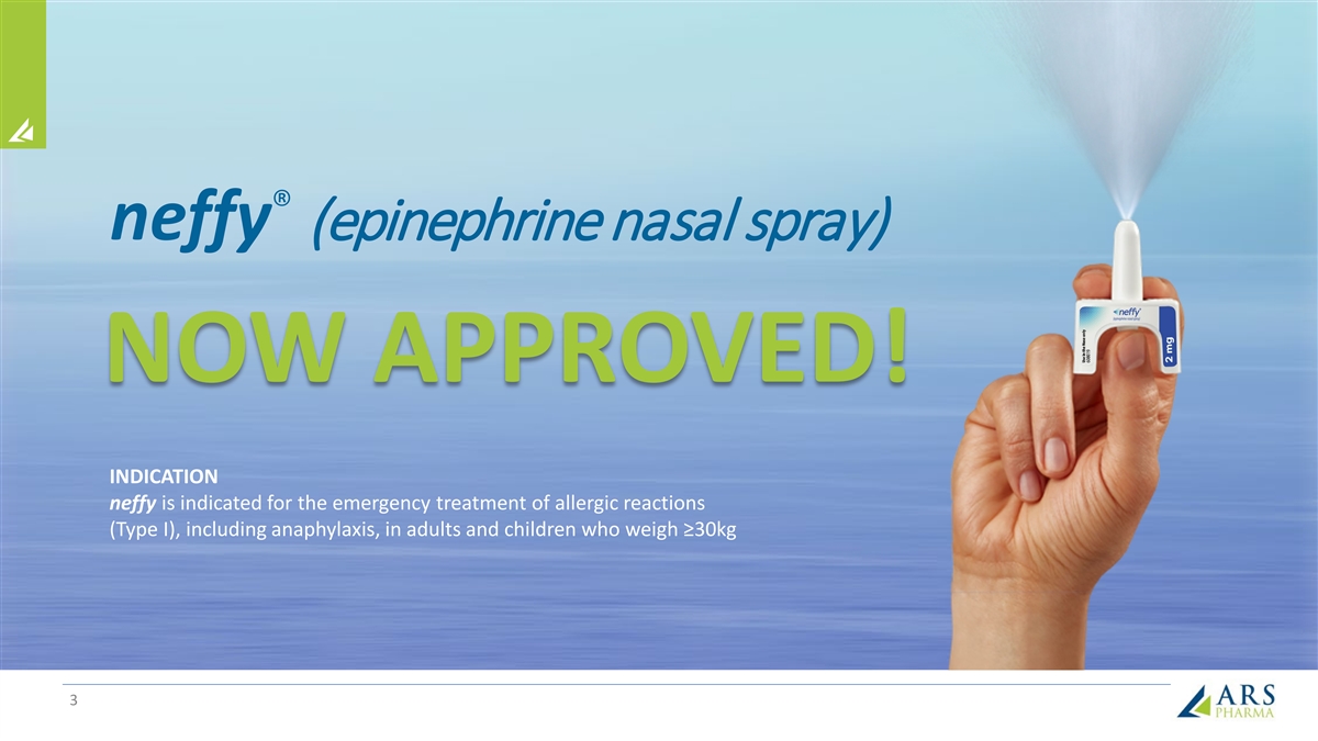 Forward-looking statements Statements in this presentation that are not purely historical in nature are “forward-looking statements” within the meaning of the Private Securities Litigation Reform Act of 1995. Forward-looking statements in this presentation include, without limitation, statements regarding: the design and potential benefits of neffy, including the likelihood allergy patients and caregivers will choose to carry and dose neffy compared to needle-bearing options; ARS Pharma’s expected competitive position; the potential market, demand and expansion opportunities for neffy; alignment with the FDA on post-marketing studies; plans to file a supplemental regulatory application for a neffy 1 mg dose for children 15 kg to <30 kg in Q3 2024; the timeline for potential regulatory approval and commercialization of neffy in Europe; the timing for potential foreign regulatory filings in, for example, China, Japan, Australia and Canada; the timing of data from the Phase 2b randomized placebo-controlled urticaria trial and initiation of a single pivotal study in urticaria; ARS Pharma’s marketing and commercialization strategies, including potential partnerships in foreign jurisdictions; the expected composition and reach of ARS Pharma’s commercial force; the potential for the neffy Experience Program; the availability and functionality of neffyconnect; the anticipated pricing and co-pay buydown; the likelihood of neffy attaining favorable coverage; the expected timing for when neffy will be commercially available; ARS Pharma’s projected operating runway; the expected intellectual property protection for neffy; and any statements of assumptions underlying any of the foregoing. These forward-looking statements are subject to the safe harbor provisions under the Private Securities Litigation Reform Act of 1995. Because such statements are subject to risks and uncertainties, actual results may differ materially from those expressed or implied by such forward-looking statements. Words such as “anticipate,” “demonstrate,” “expect,” “indicate,” “plan,” “potential,” “target,” “will” and similar expressions are intended to identify forward-looking statements. These forward-looking statements are based upon ARS Pharma’s current expectations and involve assumptions that may never materialize or may prove to be incorrect. Actual results and the timing of events could differ materially from those anticipated in such forward-looking statements as a result of various risks and uncertainties, which include, without limitation: the ability to maintain regulatory approval for neffy; results from clinical trials and non-clinical studies may not be indicative of results that may be observed in the future; potential safety and other complications from neffy; the labeling for neffy in any future indication or patient population; the scope, progress and expansion of developing and commercializing neffy; the potential for payors to delay, limit or deny coverage for neffy; the size and growth of the market therefor and the rate and degree of market acceptance thereof vis-à-vis intramuscular injectable products; ARS Pharma’s ability to protect its intellectual property position; and the impact of government laws and regulations. Additional risks and uncertainties that could cause actual outcomes and results to differ materially from those contemplated by the forward-looking statements are included under the caption “Risk Factors” in ARS Pharma’s Quarterly Report on Form 10-Q for the quarter ended June 30, 2024, filed with the Securities and Exchange Commission (“SEC”) on August 6, 2024. This and other documents ARS Pharma files with the SEC can also be accessed on ARS Pharma’s website at ir.ars-pharma.com by clicking on the link “Financials & Filings” under the “Investors & Media” tab. The forward-looking statements included in this presentation are made only as of the date hereof. ARS Pharma assumes no obligation and does not intend to update these forward- looking statements, except as required by law. 2