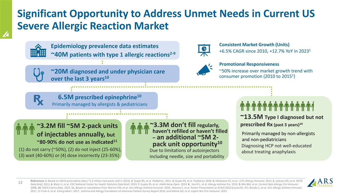 Significant Opportunity to Address Unmet Needs in Current US Severe Allergic Reaction Market Consistent Market Growth (Units) Epidemiology prevalence data estimates 1 +6.5% CAGR since 2010, +12.7% YoY in 2023 2-9 ~40M patients with type 1 allergic reactions Promotional Responsiveness ~50% increase over market growth trend with ~20M diagnosed and under physician care 1 consumer promotion (2010 to 2015 ) 10 over the last 3 years 10 6.5M prescribed epinephrine Primarily managed by allergists & pediatricians ~13.5M Type I diagnosed but not 10 prescribed Rx (past 3 years) ~3.3M don’t fill regularly, ~3.2M fill ~5M 2-pack units haven’t refilled or haven’t filled Primarily managed by non-allergists of injectables annually, but – an additional ~5M 2- and non-pediatricians 11 ~80-90% do not use as indicated 10 pack unit opportunity Diagnosing HCP not well-educated (1) do not carry (~50%), (2) do not inject (25-60%), Due to limitations of autoinjectors about treating anaphylaxis (3) wait (40-60%) or (4) dose incorrectly (23-35%) including needle, size and portability References: 1. Based on IQVIA prescription data (~5.2 million two-packs sold in 2023). 2. Gupta RS, et al. Pediatrics. 2011. 3. Gupta RS, et al. Pediatrics 2018. 4. McGowan EC, et al. J Clin Allergy Immunol. 2013. 5. Jackson KD, et al. NCHS 12 Data Brief. 2013. 6. Black LI, et al. CDC National Center for Health Statistics Data Brief. 2019. 7. Gupta RS, et al. JAMA Netw Open. 2019. 8. Verrill L, et al. Allergy Asthma Pro. 2015. 9. Bilo BM, et al. Current Opin Allergy Clin Immunol. 2008. 10. IQVIA Claims Data, 2023. 11. Based on calculations from Warren CM, et al. Ann Allergy Asthma Immunol. 2018., Rooney E, et al. Poster Presentation at ACAAI 2022 (Louisville, KY). Brooks C, et al. Ann Allergy Asthma Immunol. 2017., El Turki A, et al. Emerg Med J. 2017., Asthma and Allergy Foundation of American Patient Survey Report 2019, and Mehta GD, et al. Expert Rev Clin Immunol. 2023.