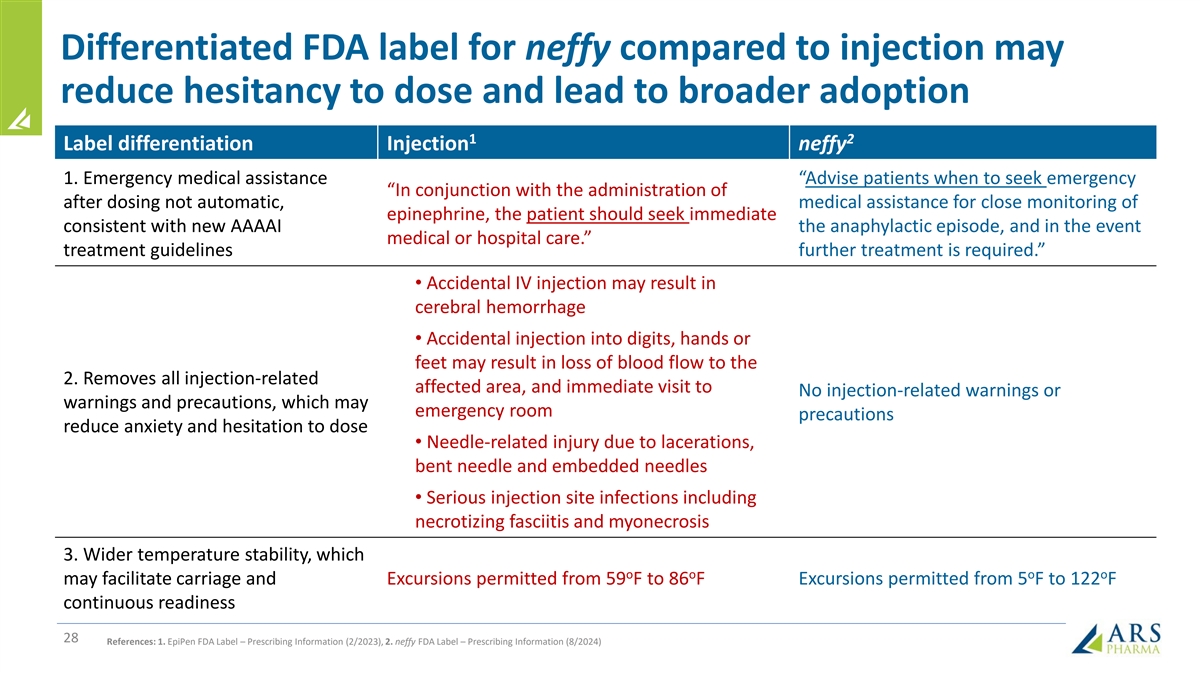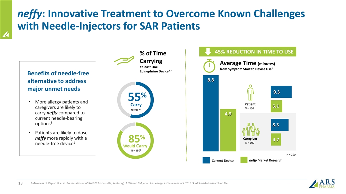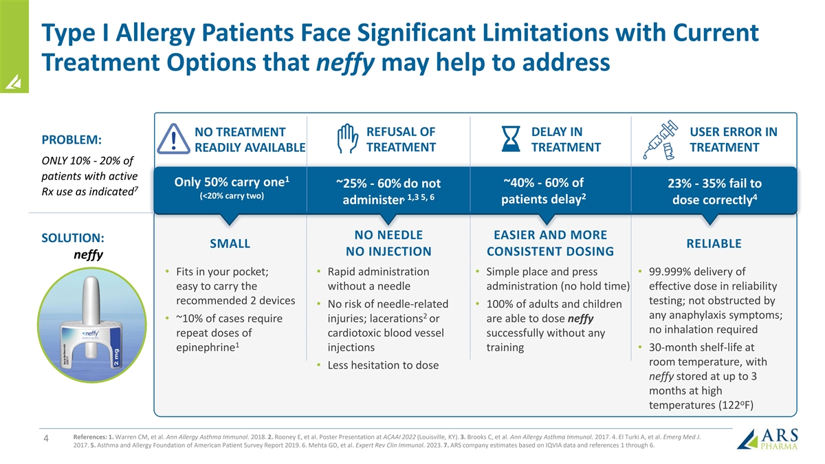 Type I Allergy Patients Face Significant Limitations with Current Treatment Options that neffy may help to address REFUSAL OF DELAY IN NO TREATMENT USER ERROR IN PROBLEM: TREATMENT TREATMENT READILY AVAILABLE TREATMENT ONLY 10% - 20% of patients with active 1 Only 50% carry one ~25% - 60% do not ~40% - 60% of 23% - 35% fail to 7 Rx use as indicated (<20% carry two) 2 , 1,3 5, 6 4 patients delay administer dose correctly NO NEEDLE EASIER AND MORE SOLUTION: SMALL RELIABLE NO INJECTION CONSISTENT DOSING neffy • Fits in your pocket; • Rapid administration • Simple place and press • 99.999% delivery of easy to carry the without a needle administration (no hold time) effective dose in reliability recommended 2 devices testing; not obstructed by • No risk of needle-related • 100% of adults and children 2 any anaphylaxis symptoms; • ~10% of cases require injuries; lacerations or are able to dose neffy no inhalation required repeat doses of cardiotoxic blood vessel successfully without any 1 epinephrine injections training • 30-month shelf-life at room temperature, with • Less hesitation to dose neffy stored at up to 3 months at high o temperatures (122 F) References: 1. Warren CM, et al. Ann Allergy Asthma Immunol. 2018. 2. Rooney E, et al. Poster Presentation at ACAAI 2022 (Louisville, KY). 3. Brooks C, et al. Ann Allergy Asthma Immunol. 2017. 4. El Turki A, et al. Emerg Med J. 4 2017. 5. Asthma and Allergy Foundation of American Patient Survey Report 2019. 6. Mehta GD, et al. Expert Rev Clin Immunol. 2023. 7. ARS company estimates based on IQVIA data and references 1 through 6.