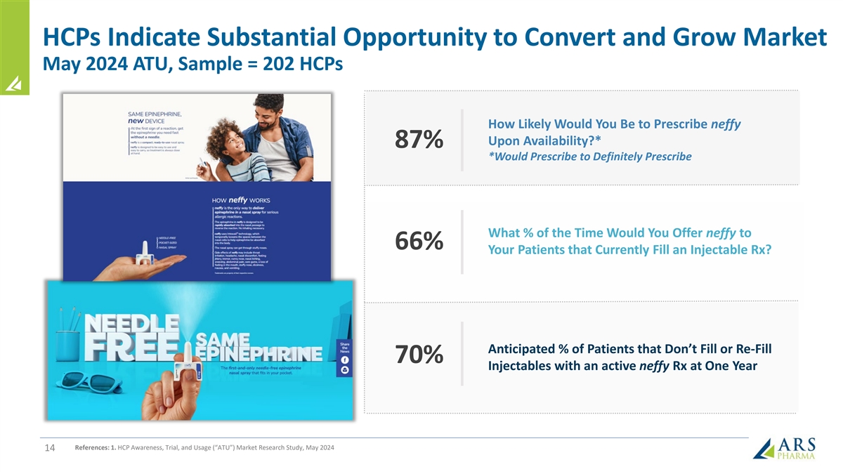 neffy: Innovative Treatment to Overcome Known Challenges with Needle-Injectors for SAR Patients 45% REDUCTION IN TIME TO USE % of Time Carrying Average Time (minutes) at least One 1 from Symptom Start to Device Use 2,3 Epinephrine Device Benefits of needle-free 8.8 alternative to address major unmet needs 9.3 % 55 • More allergy patients and Patient Carry 5.1 caregivers are likely to N = 100 2 N = 917 carry neffy compared to 4.9 current needle-bearing 3 options 8.3 • Patients are likely to dose % neffy more rapidly with a Caregiver 4.7 85 1 N = 100 needle-free device Would Carry 3 N = 150 N = 200 Current Device neffy Market Research References: 1. Kaplan H, et al. Presentation at ACAAI 2022 (Louisville, Kentucky). 2. Warren CM, et al. Ann Allergy Asthma Immunol. 2018. 3. ARS market research on file. 13