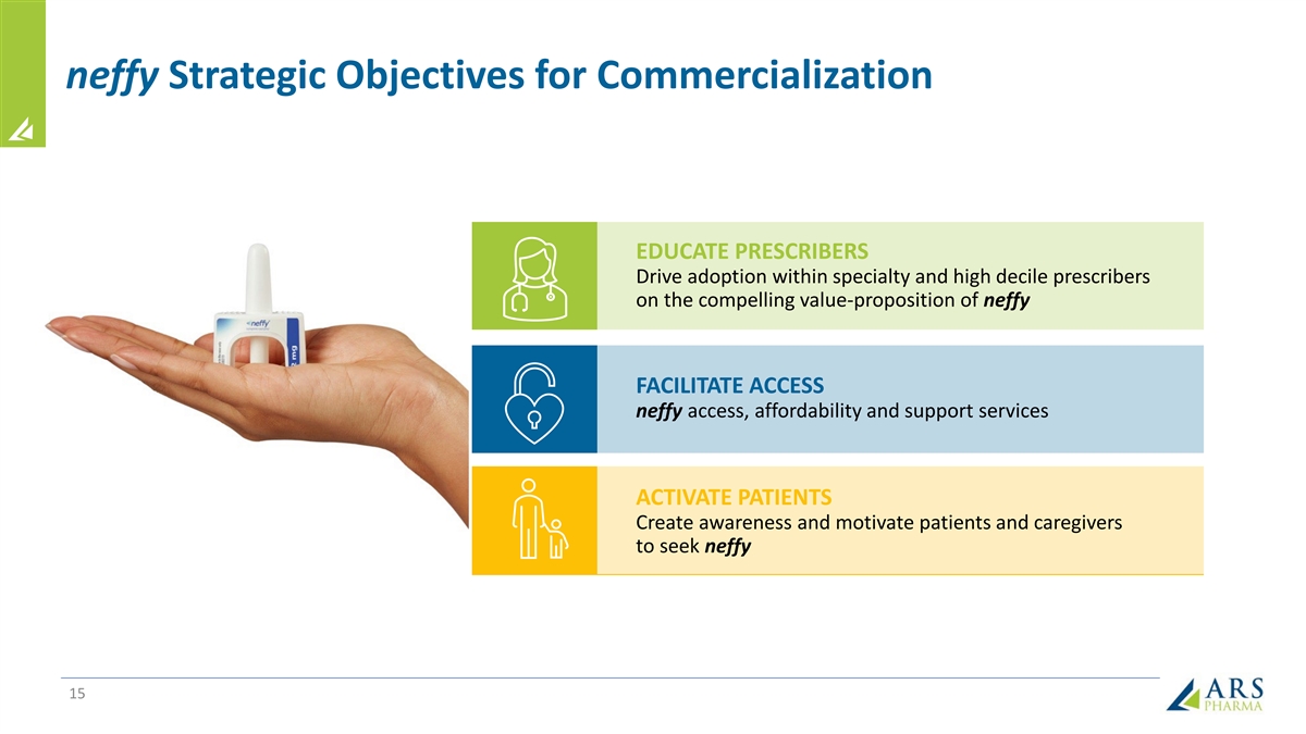 HCPs Indicate Substantial Opportunity to Convert and Grow Market May 2024 ATU, Sample = 202 HCPs How Likely Would You Be to Prescribe neffy Upon Availability?* 87% *Would Prescribe to Definitely Prescribe What % of the Time Would You Offer neffy to 66% Your Patients that Currently Fill an Injectable Rx? Anticipated % of Patients that Don’t Fill or Re-Fill 70% Injectables with an active neffy Rx at One Year References: 1. HCP Awareness, Trial, and Usage (“ATU”) Market Research Study, May 2024 14