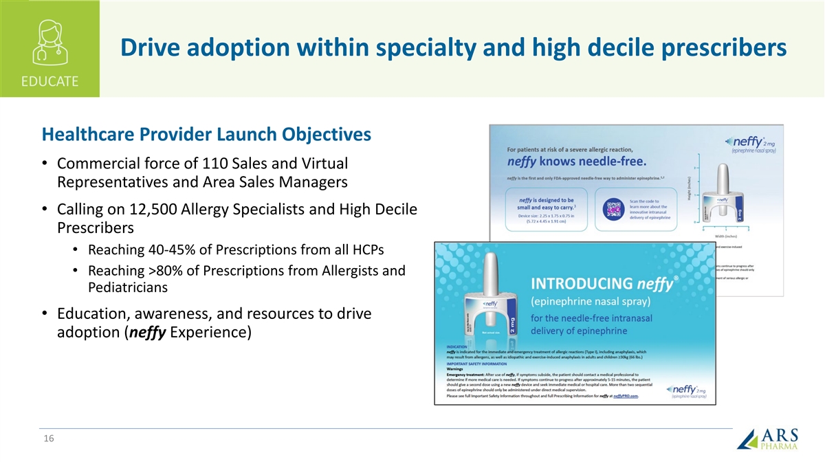 neffy Strategic Objectives for Commercialization EDUCATE PRESCRIBERS Drive adoption within specialty and high decile prescribers on the compelling value-proposition of neffy FACILITATE ACCESS neffy access, affordability and support services ACTIVATE PATIENTS Create awareness and motivate patients and caregivers to seek neffy 15